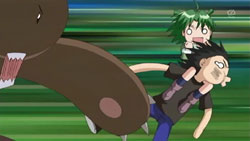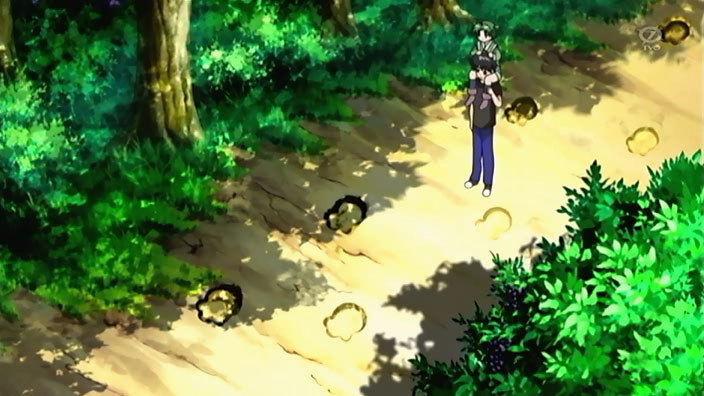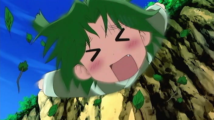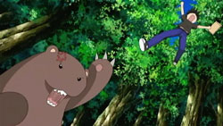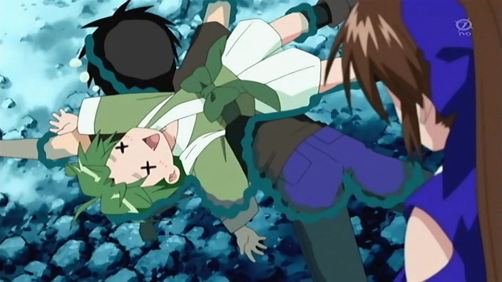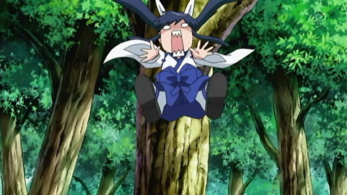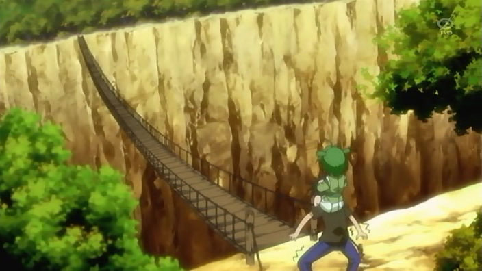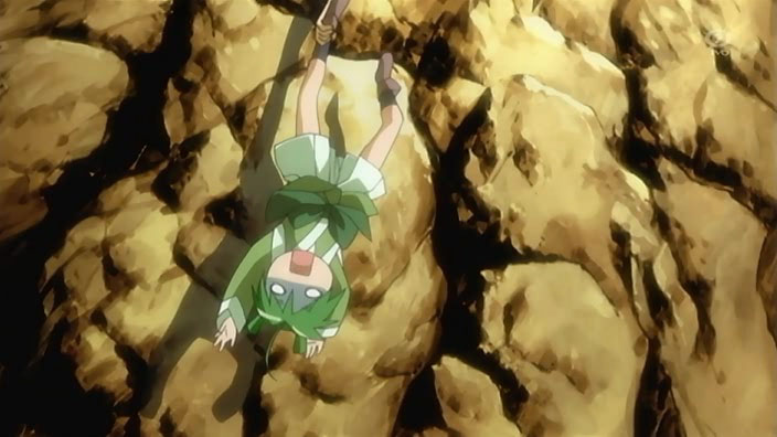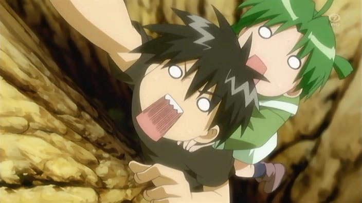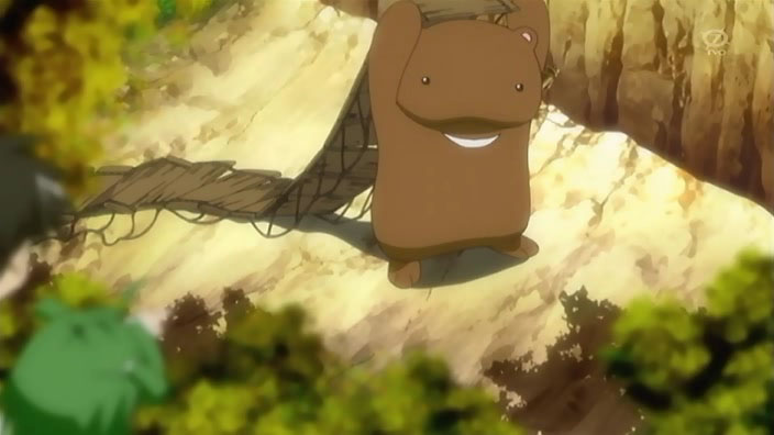 Back to Ikuto and Yukino, they find themselves on one of those rickety bridges you see on every deserted island. Except this one actually breaks, and leaves our hero and his sidekick hanging upside down against the side of a cliff. Some dude saves them right as they’re about to fall…yep, it’s Kuma Kuma.