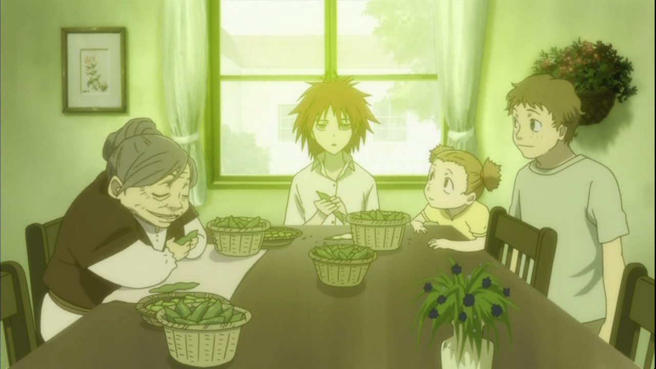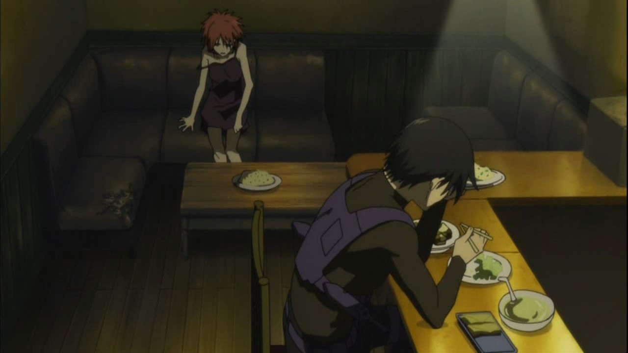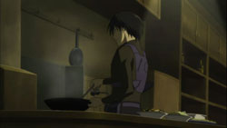 Meanwhile, Misaki is thinking to herself about BK-201 and the organization that exists behind him when the detective Saitou reports that the MI6 group is under the watch of Matsumoto and Kouno. To their surprise though, November 11, April, and July suddenly show up with November 11 commenting on how this is the place that July detected earlier. It’s only after they appear that Misaki gets a phone call from Matsumoto and Kouno apologizing for losing sight of MI6. November 11 then convinces Misaki to let them help out because their opponent is a cursed Contractor who took away a feared Contractor and because he says that they don’t want any innocent victims. At that very moment, Havoc is dreaming of her past when she had been shelling beans with a happy family. She wakes up to the sound of Hei cooking, and he soon lays a plate of fried rice in front of her. As Havoc watches Hei eat his own dinner, she comments on how he’s eating a lot as usual and wonders if he always personally cooks. She then explains that until she lost her power, she didn’t think that meals could be enjoyable. She recalls that she had met the family of a woman named Laura and had helped them cook. Havoc had been so happy when the children had wanted to eat her cooking, and she came to want to see their happy faces. As the price of her contract though, she had sipped the lifeblood of the children.