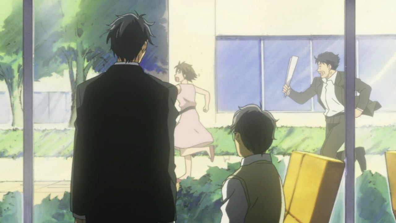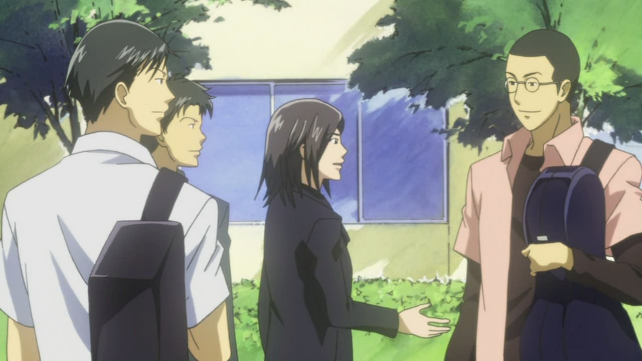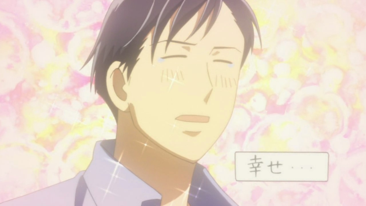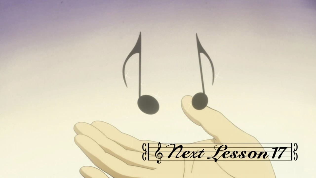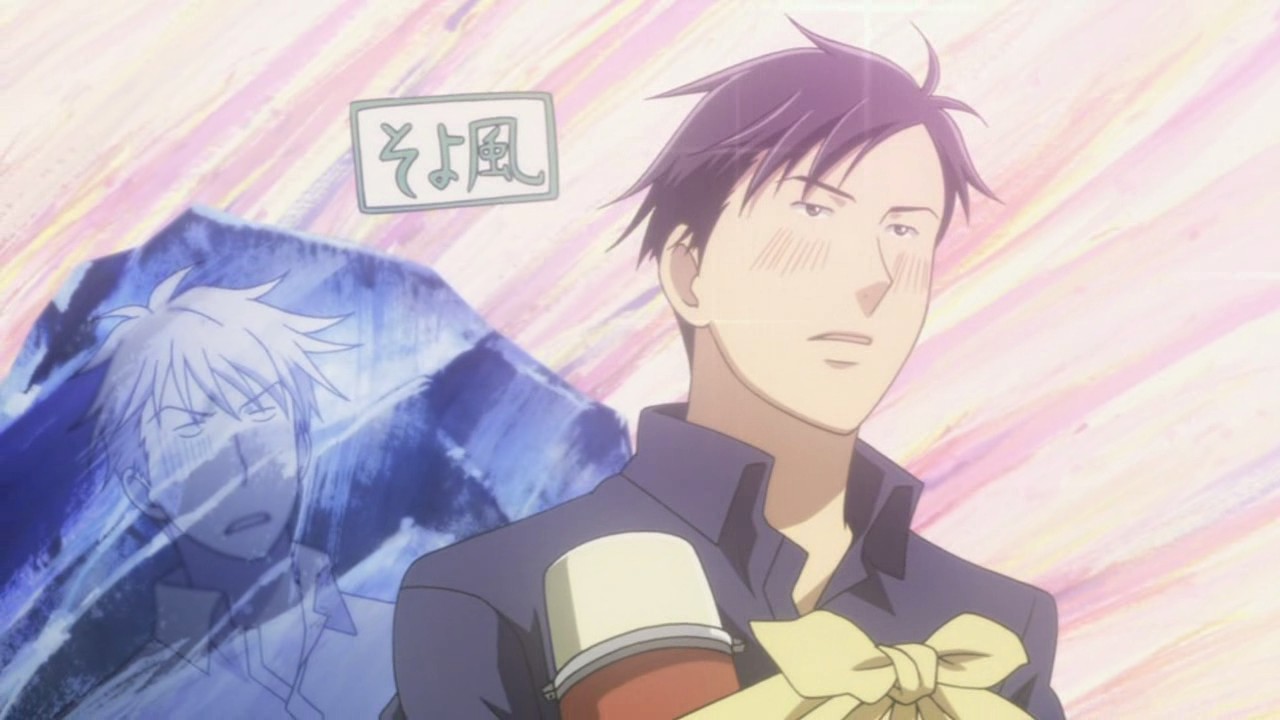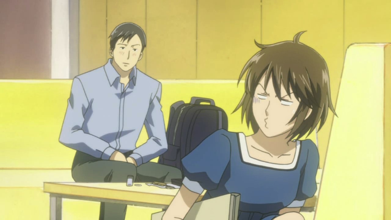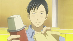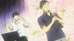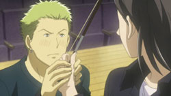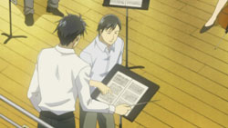 The next day, Kuroki is trimming his own reed when he notices Nodame hiding nearby. As he returns the thermos from the miso soup, Kuroki introduces himself and compliments her for the food. He reveals that he’s here so early because he needed to shave his reed since oboe players need to make their own reeds. Because there is no such thing as a perfect reed, Kuroki feels that oboes are incomplete instruments, but he still likes oboes. This reminds Nodame of how she enjoys playing the piano, but also of how Chiaki wants her to aim for a higher goal. She thus asks Kuroki if he’s aiming for a higher goal such as becoming a professional and if it’s weird that someone trying to be a kindergarten teacher also aims for a higher goal. Kuroki doesn’t quite understand what she means, but he tells her that he’s happier if he can play the oboe better. Etou meanwhile finds Chiaki on campus and explains the situation with Nodame. Chiaki feels that Etou doesn’t give normal lessons since he carries that harisen, despite Etou’s claims that the harisen embodies his love. Chiaki is then reminded of how Nodame doesn’t run away from him even though he abuses her the same way that Etou did, and in the end, he comes up with a plan for the instructor.