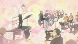Having recruited the right people, Chiaki conducts his new orchestra in practicing Mozart’s Oboe Concerto in C major, K. 314. However, since the piece only requires 35 people, Mine isn’t chosen to participate. Chiaki is very impressed with all the musicians who were chosen, particularly the oboe soloist Kuroki, though Chiaki does wish that Kuroki played with more flair. On the home front, he finds Nodame as hungry as ever, which signifies to him that she’s not ghost-like as Mine’s father had described her. Still, when he asks her about her studies, she avoids the question and talks about bringing him lemons in honey instead. Chiaki absolutely refuses to let her come to practice because he doesn’t want to play around with this orchestra, yet Nodame shows up at their next practice anyway. This causes him to get angry at her and question her about going to her lesson today, but Nodame claims that her teacher is sick. Their conversation is interrupted by Kuroki, so Nodame takes the opportunity to give Kuroki the onigiri and miso soup that she made for everyone. After Nodame leaves, Chiaki notices how smitten Kuroki is with her, particularly after he tells Kuroki Nodame’s name.