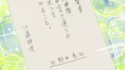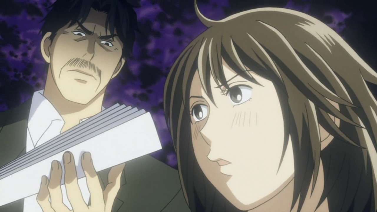A little while later, Nodame finds a trail of Puri Gorota figures and follows it all the way until she’s trapped by Etou in a practice room. When she tries to escape out the window, he reveals that he got rid of the harisen and apologizes for hitting her. Nodame finally agrees to take lessons from him, but she makes him sign an agreement first stating that he has to help her compose the final song of her Moja Moja Suite. Etou goes along with this and has a condition of his own for Nodame: after they compose the last song, she’s to take real lessons from him.