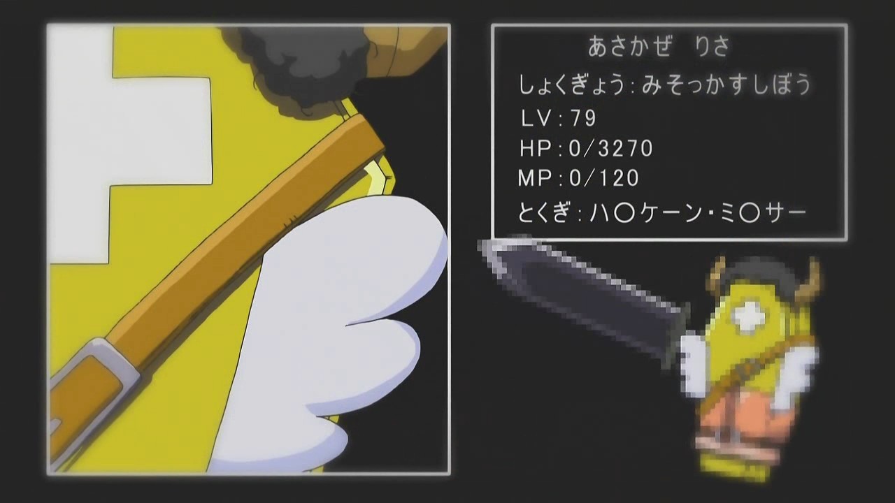 Nagi is playing a game on her Famicom when her character gets killed, and the game proceeds to insult both her and Sakuya. After they leave the system to have dinner, it starts exuding an evil aura. The next morning, the same sequence of events occur as on the day Hayate was forced to cosplay. However, it seems that Sakuya actually comes back to the mansion after leaving for school and finds that the Famicom video game had come alive. She immediately gets her two bodyguards to douse it with fire extinguishers and then sends them to hit the reset button. However, the television suddenly spews out a ton of takoyaki and nearly drowns them. The culprit is the buxom Demon King who lives at the top of a tower, but she appears to be strapped into her throne. She wants to be free and plans to do so by getting a hero to fight her as the final boss. To capture a hero, she lays out game controllers as lures all over Nagi’s mansion, but most get stepped on and destroyed.