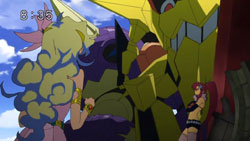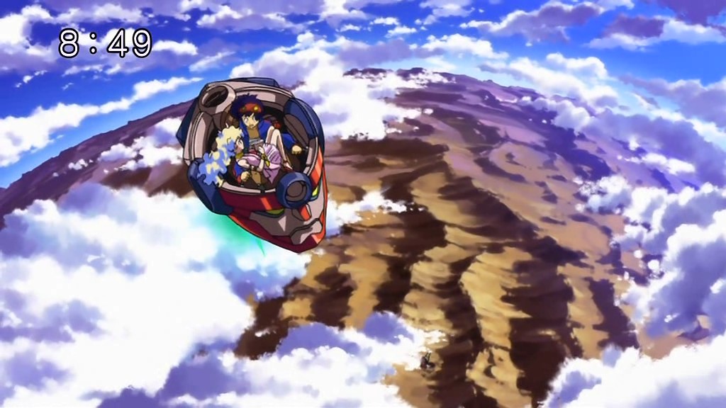 On the bridge of the Daigurren, Nia suggests that Guame is afraid of Simon, but Guame doesn’t even know who that is, so Nia explains that Simon is the person who first helped and who’s always protected her. Realizing that Simon must be the pilot of the Lagann, Guame decides to execute Simon first, much to Nia’s horror. Guame also decides to kill Nia right there because she won’t accept his offer to work for him, but Nia doesn’t think that she’ll die because she believes in Simon just like he believed in Kamina. Fortunately for Nia, old man Coco saves her by knocking Guame’s gun to the side right as he fires a shot. Before Guame can get a hold of what’s going on, the ground starts shaking, and the Lagann emerges from the below the bridge. Nia is in tears because Simon came to save her, and the two blast off into the sky above where Simon tells her that he understands now thanks to the Lagann. Seeing that Simon’s hands are so bruised, Nia gets him to let her take the controls, and the two work together.
