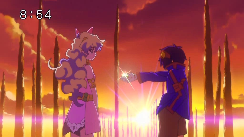 That place is the ravine that’s filled with boxes of what Nia now knows contain thrown away princesses. She wants to bury all of them in a bright place, and after everyone helps her do so, Nia admits that her father was everything in the world to her – that’s why she wanted to believe him until the end. As she once again wonders why they were born, Simon gives her a gem that he found while digging earlier. He feels that regardless of her birth and being a princess, the Nia living now is the real Nia, so it’s fine for her to live as herself, and he’ll live as himself too. Kittan agrees with this and gives Simon the position of leader since he was the one Kamina chose. And now that they know the location of the capital, they head straight for there.