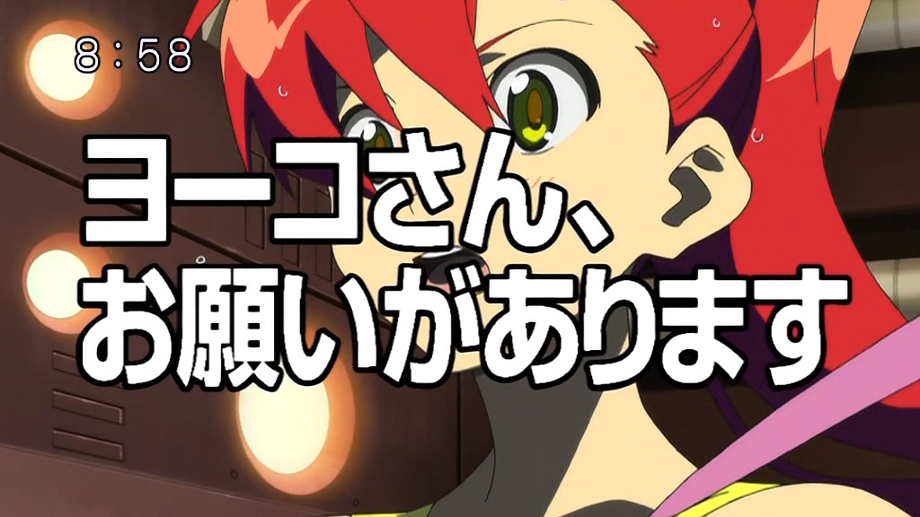 Who knows what she’ll ask, but it should be interesting. Maybe Nia will ask Yoko how her boobs got so big for her age? =P But it does seem like Nia has stollen the female lead now. Yokos just there for the kamina flashback and d0rama! Now that Simons over his emo self, we’ll finally get some development.