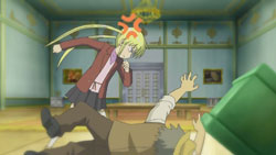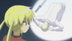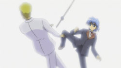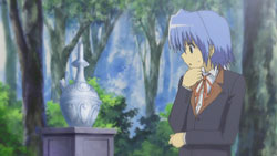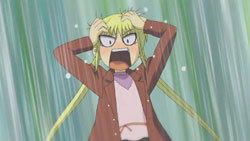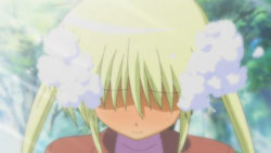 Hayate is able to dodge the sword of the man who suddenly attacks him, and Nagi thinks that this man is after the Sanzenin inheritance. Earlier, after Mikado had said that she was going to die, he had explained that there were relatives who didn’t want Nagi to get the inheritance. In response to that, Mikado had decided that there would be a condition that someone who wanted the inheritance would have to fulfill in order to get it instead of Nagi. That condition was to make Nagi cry, apologize, and willingly give up her fortune. Nagi of course would rather die than do something embarrassing like that, and she certainly has no intention of doing so for the man attacking her and Hayate now, even when he begs her to. This man then starts to attack Hayate because Mikado had suggested that hurting him would cause Nagi to cry and apologize. Not knowing about Nagi’s stocks and own fortune, Hayate assumes that she’ll be impoverished if she doesn’t get the inheritance and feels bad about his unpaid debt. He resolves to think of a way to pay it back quickly, and even though he doesn’t know the meaning of his life, he decides to protect Nagi for now.