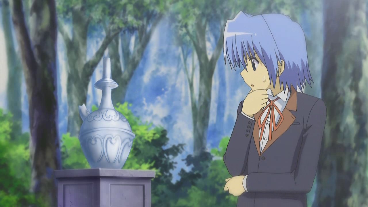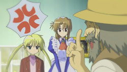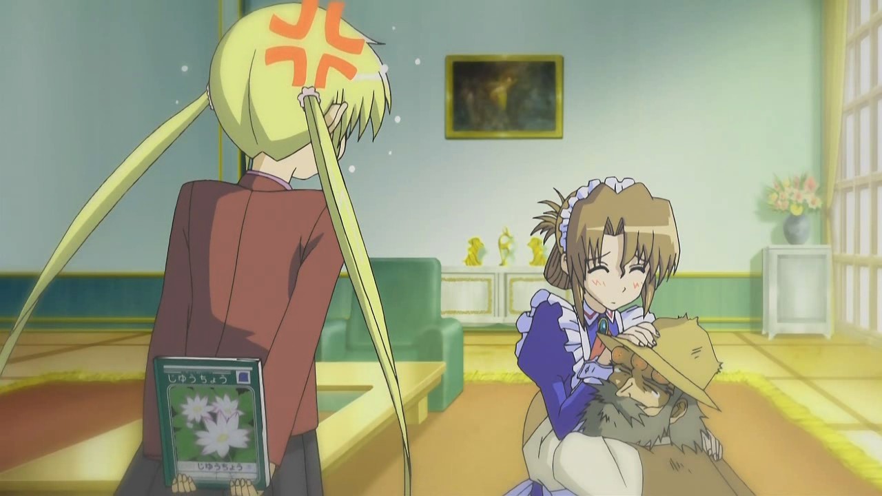 Maria one day suggests that they visit Nagi’s grandfather Mikado, the head of the Sanzenin family, a man who Nagi feels could erase Hayate’s existence. Nagi isn’t so keen on going, but Maria reminds her that her grandfather is her only living blood relative. Sakuya joins them on the trip since she claims to be a relative too, and she and Nagi tell Hayate of how scary Mikado is. As they approach by helicopter, Hayate discovers that Mikado lives in a castle that’s even bigger than Nagi’s mansion. Two lines of butlers and maids are standing at the entrance when they arrive, though Hayate initially gets restrained because he looks so seedy and poor. Hayate gets depressed that he looks this way, and it gets him thinking about his debt again when he’s sent back outside so that Nagi can change clothes. In the garden, he notices a fancy vase that he thinks is worth the 150 million yen he owes, but a voice tells him that the vase is only worth 5 million yen. That voice belongs to a seemingly friendly old man who Hayate initially thinks is a gardener. This man leads Hayate to a vantage point where he can see Nagi and Maria changing, and Hayate knows enough to drag him away.
