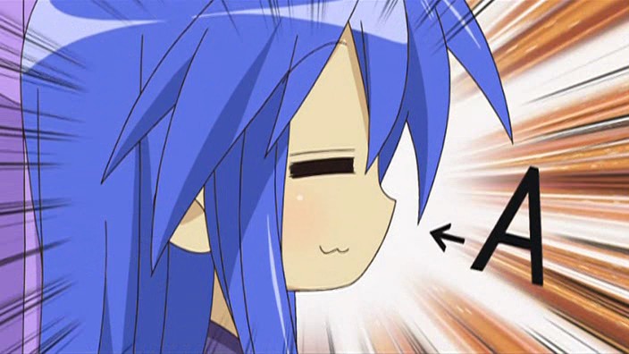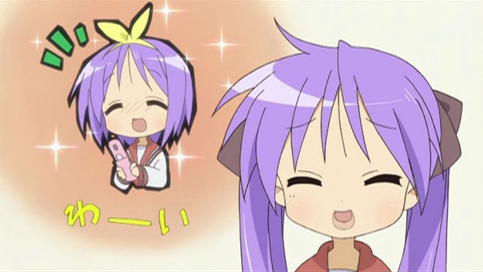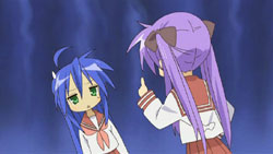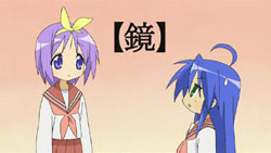 -interesting scene where konata experiments with “kyou-chan” as kagami’s nickname (while the kanji slowly switches on-screen from “mirror”/kagami to “strong”/kyou to “kyou” found in the japanese words “violent” and “misfortune” xD)