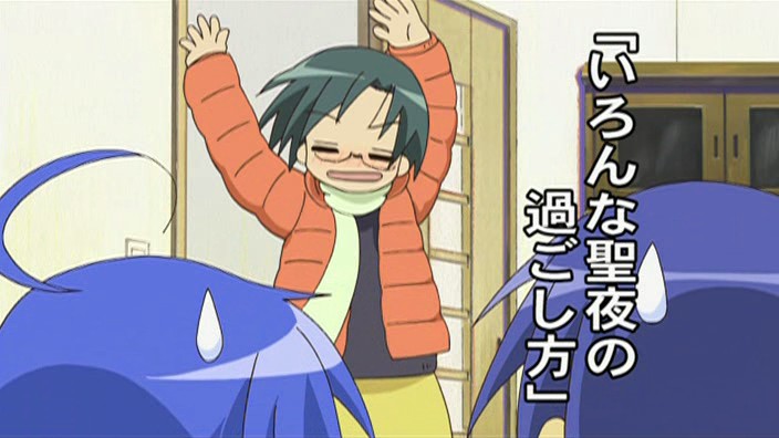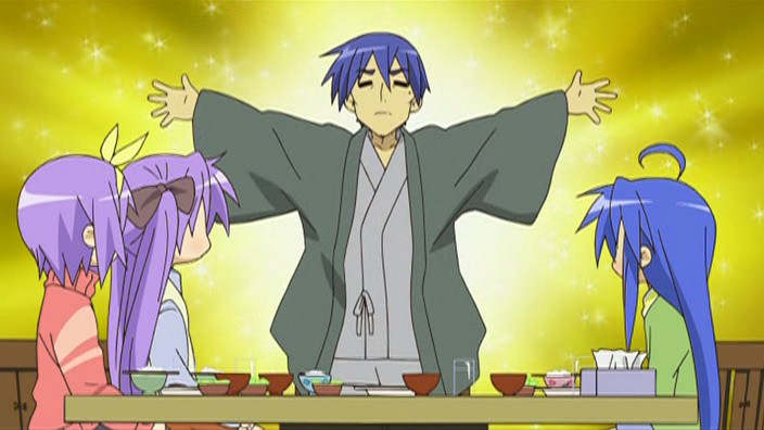“Though I find the product inserts a bit annoying, the rest of the show appears to be major win (Kagami neck and shoulders… mmmm; Kona-mom; Tsukasa and cellphone goodness; and Kona-dad).”
