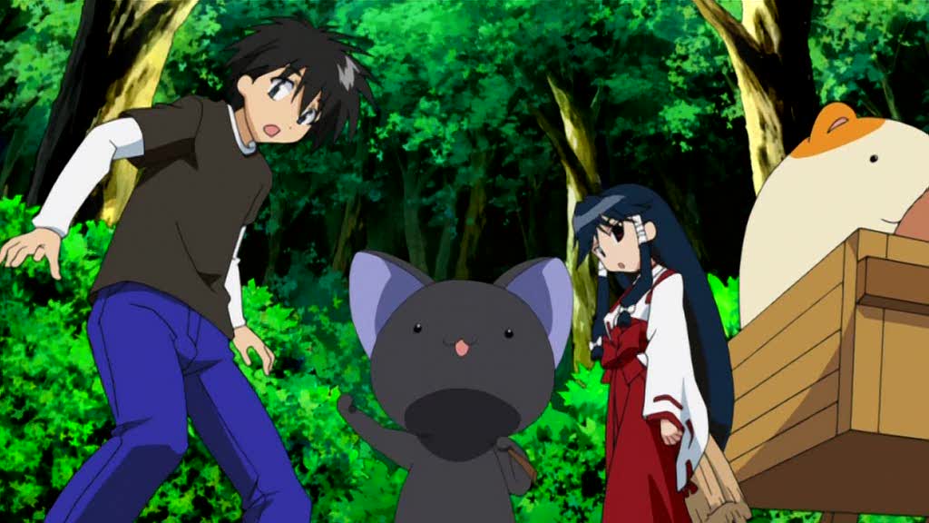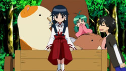 Some cute green haired chick in a pink kimono is eating shaved ice with Kamo^2 and Kuma^2 when Ikuto walks by. Nope, it ain’t Yukino – it’s her mom! Yay for underage moms. “Call me Kagami-chan~” she says. *fist-pound*