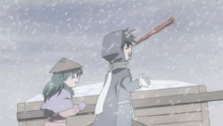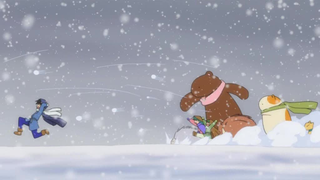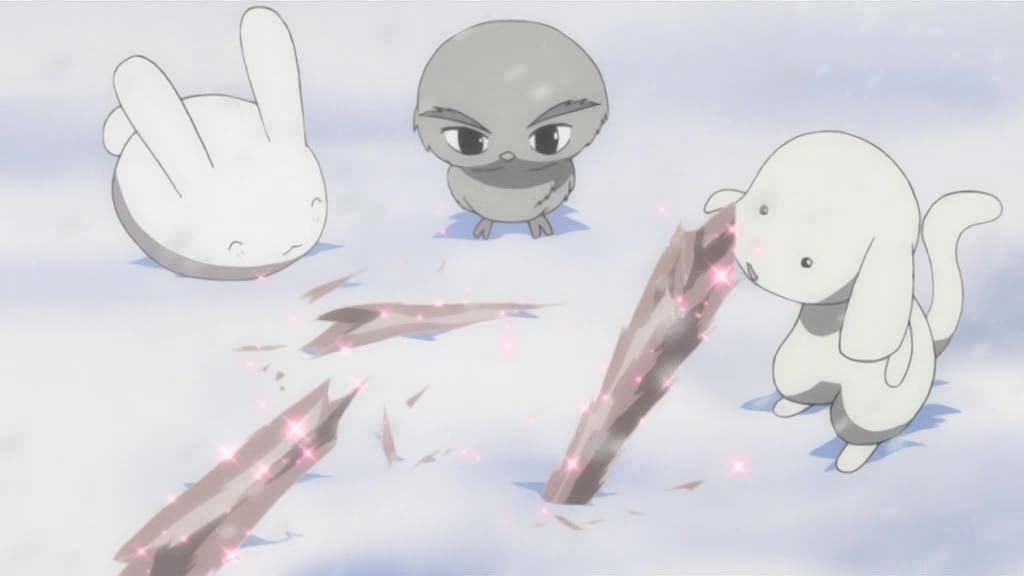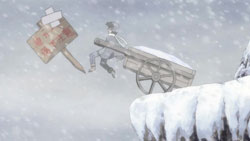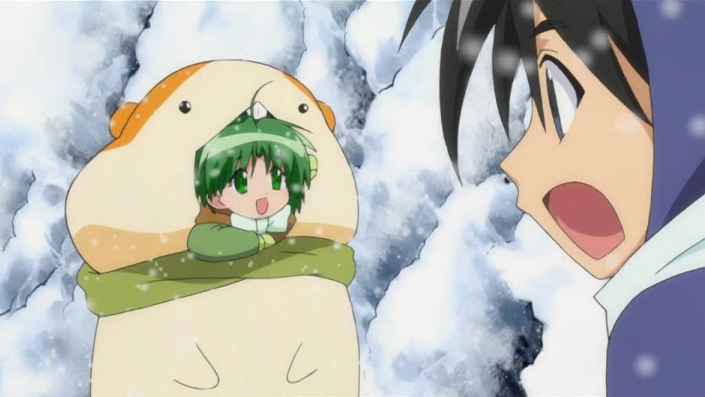 So they’re heading up the mountain…and then it starts snowing. It’s cold as hell as Ikuto is getting annoyed…reminds me of that one scene in Lord of the Rings when the whole group is trudging through neck-high snow, and Legolas is watching on top of it all…that elfish bastard. Similarly, Yukino is hitched up in the poka poka mouth of a giant hamtaro and Normad-chan is perched up on Taka^2 and speeding ahead.