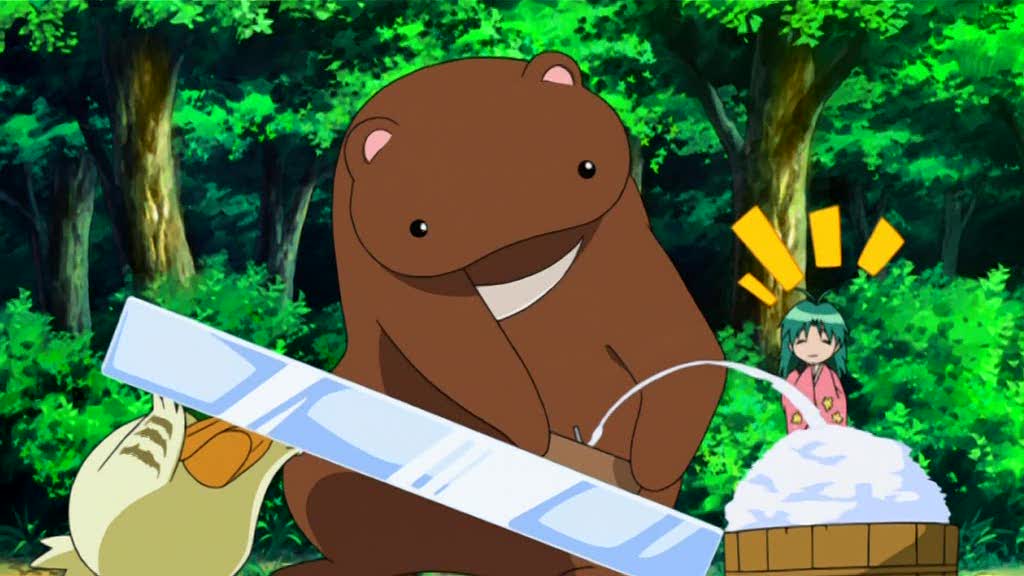 So like something out of Looney Tunes, they all get rolled up into a giant katamari, which is sent off a ski jump and falls…falls…falls all the way down to ground level, where Machi is sitting, waiting for her ice. Mmm, fresh. Apparently her topping of choice is… soy sauce.