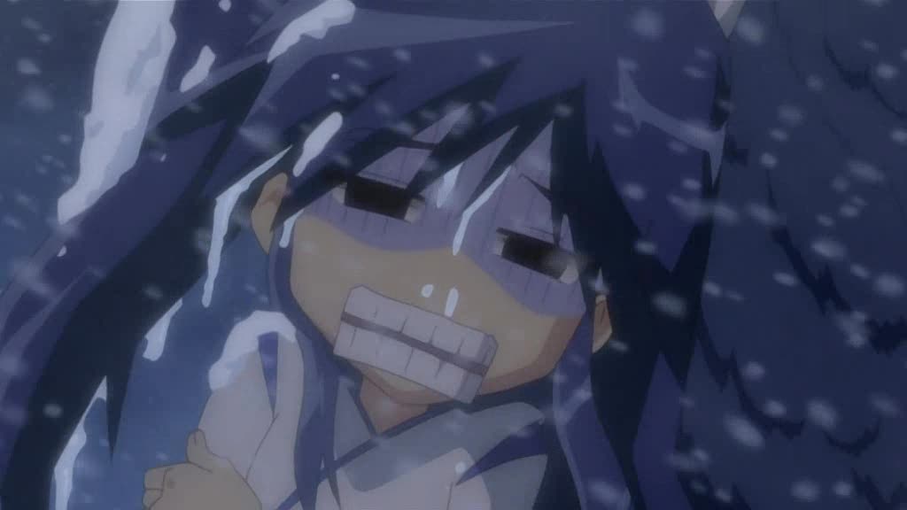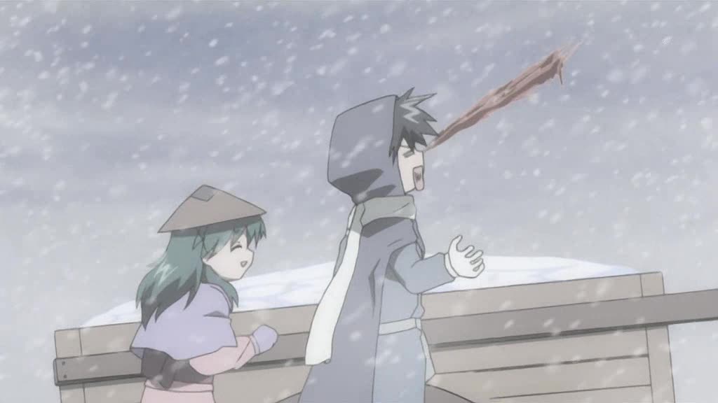 Inexplicably, they start having a snowball fight. Then shack up to have snacks. Ikuto gets pissed off that they’re wasting time and wants to grab his ice and leave, which gets Normad-chan all suspicious as she asks Ikuto if he’s “done this and that” with Suzu – instant nosebleed. Except this time it freezes as its coming out, and falls on the ground as glistening bloodsicles. Hmm…that’s bloody hilarious.