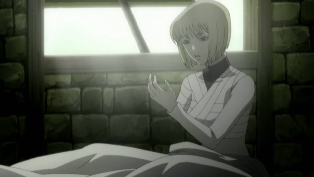 In one motion, this stranger hits Ophelia on almost every part of her body. This also uncloaks her, and Clare recognizes the person as none other than Quick Sword Ilena, the same person who had been sent to kill Teresa. However, Clare loses consciousness soon after and when she wakes up again, she finds herself in bed in Ilena’s cabin. After Ilena tells her that she blacked out after attaching her hand and has been asleep for a week, Clare panics because she has something she has do, but Ilena shoves her back onto the bed. Ilena knows that Ophelia isn’t dead, and without her sword arm, Clare now has to fight with only her other one. After telling Clare to think about her place, Ilena heads outside to practice her technique on a tree. Clare comes out once she’s eaten a bit, and, because Ilena asks how Clare knows her name, Clare recalls everything that happened with Teresa. This causes Ilena to question if Clare has Teresa inside of her and deduces that Clare wants to go after Priscilla. She warns Clare against it because Priscilla’s power is overwhelming, especially for someone like Clare who is only one-fourth Yoma since she took on Teresa’s blood instead of going through the normal procedure.