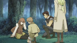 During dinnertime at the Gradisca mines, Romeo is looking at the handkerchief Juliet gave him when one of the laborers snatches it away. The others throw it around while Romeo tries to get it back, but when Giovanni gets his hands on it, he returns it to its rightful owner. The next day, Juliet and the others in the Capulet group stop at a river bank on their way to Mantua. Juliet becomes captivated by a large tree and suddenly experiences flashbacks of her encounter with Escalus and Ophelia which cause her to collapse. At the same time, a huge earthquake hits the Gradisca mines, causing more rocks to fall from the ceiling. Romeo once again manages to get out relatively unhurt, but the others are not so lucky. The man closest to Romeo – who happens to have been one of the men who picked on him earlier – has his leg trapped, so Romeo tries to get the rock off. However, it is ultimately Giovanni who provides the brute strength that lifts the rock up long enough for the man to get pulled out from under it. Outside the mines, Romeo finds numerous hurt laborers being helped by their fellow men, but the officer in charge of the mines Paolo is more worried about the collapse of the mining operations. Not caring about the injuries, Paolo tries to order the men back to work, but Romeo overrides this by declaring that the mine will be abandoned. He feels that the laborers here have atoned for their crimes and announces that everyone is going back to Neo Verona. When Paolo tries to object, Romeo reminds him who’s in charge and then starts issuing orders to the others.
