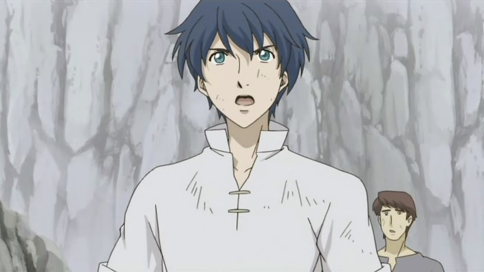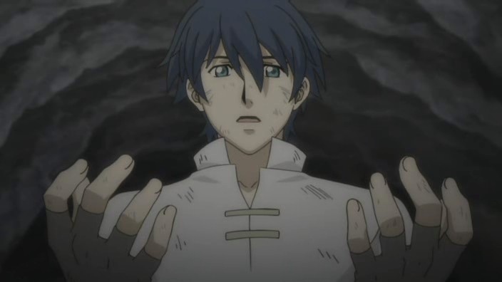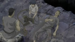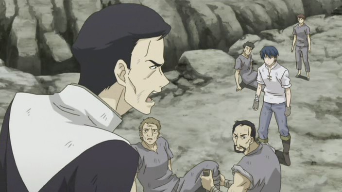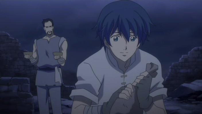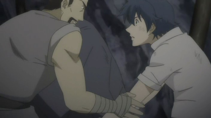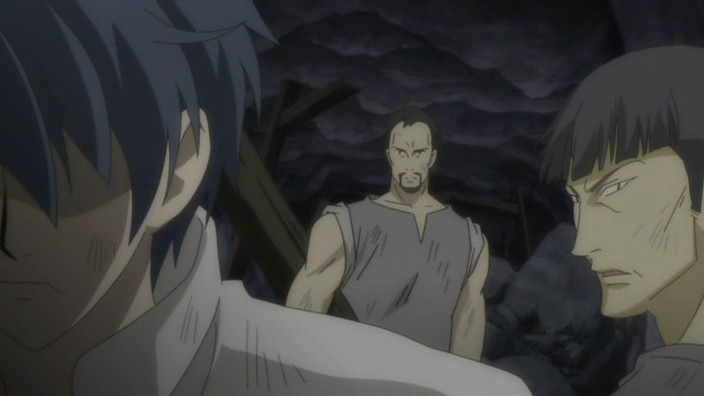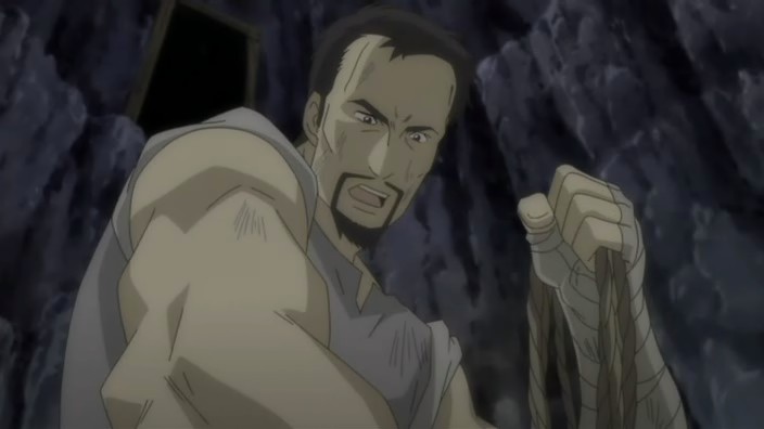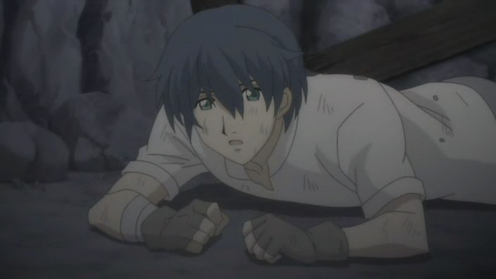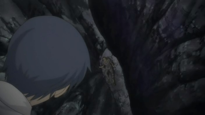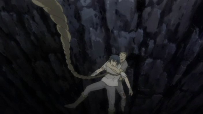 After helping free more people from the rubble, Romeo learns that there is still one more person missing. Not wanting anyone else to die, Romeo goes searching for this missing man named Pietro and eventually finds him stuck on a ledge above a dark hole inside another cave. Pietro has hurt his leg, and the ledge is crumbling, so Romeo starts to climb down to get him, but he’s stopped by Giovanni who provides a rope to lower him down with instead. Romeo allows Pietro to grab onto his back and then starts climbing back up, but yet another earthquake strikes and causes Romeo to lose his grip. He and Pietro are saved only by Giovanni’s strength holding onto the rope, and it is Giovanni finally who pulls them up. In the aftermath, the wounded get treated and Giovanni brings Romeo his soup dinner. When he finds Romeo digging through the rubble looking for the bag with everything Petruchio had left behind, Giovanni questions if Romeo can really return them to Neo Verona since they are prisoners who probably won’t be let back into the city. Romeo suggests that they’ll live in a new land somewhere and explains his promise to create a world where they can all live together – he doesn’t want a world where someone has to make a sacrifice. Giovanni laughs at the idea because it’s a dream, but he says that he doesn’t hate it. The men who picked on Romeo earlier now also find him, and after thanking him and apologizing for the handkerchief incident, Pietro shows that he also has a ring that he wears on a necklace. It reminds him of a person precious to him, and everyone here has someone like that. As Romeo runs off to join them for dinner, Giovanni thinks to himself that the world Romeo is aiming for is down a long and rocky path.