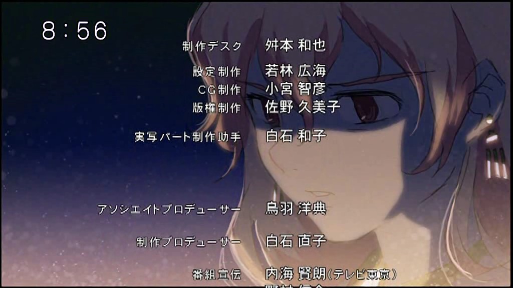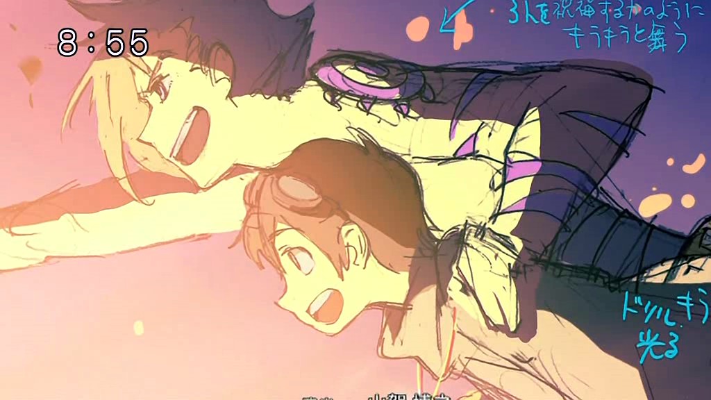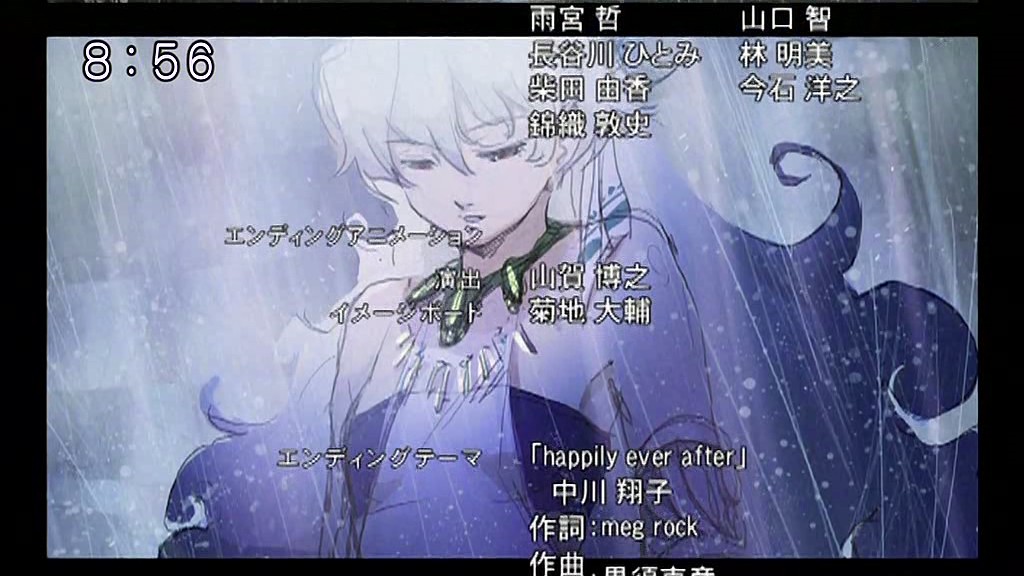 happily ever after is a song that has been used a few times already, but this is its first appearance as an actual ED. More interesting are all of the storyboard scenes that this ending sequence shows of events we’ve already seen. I just can’t get over how good some of them look (most of them could be made into wallpapers), and it’s interesting to see how they got translated into the episodes.