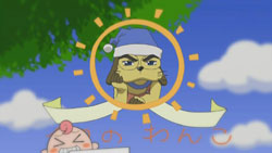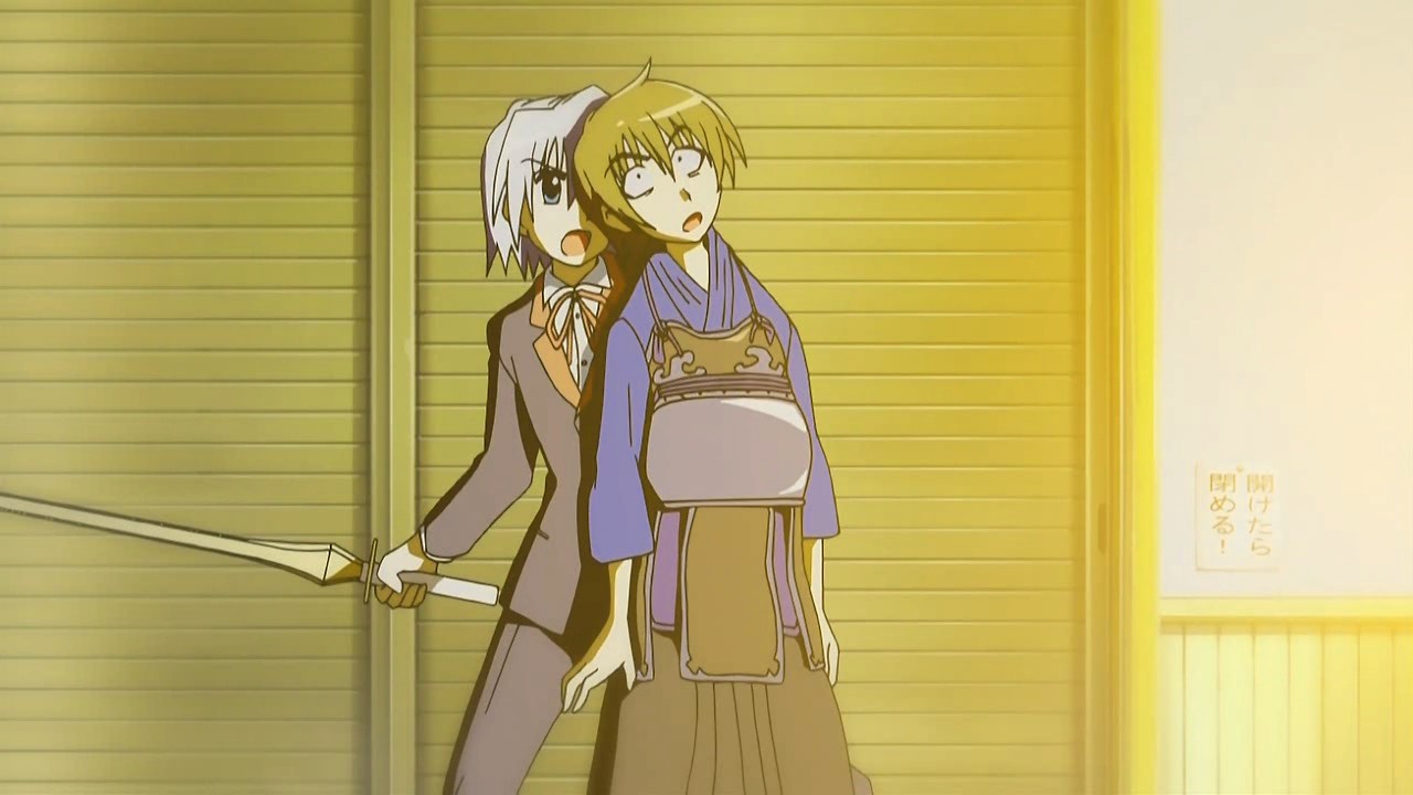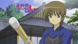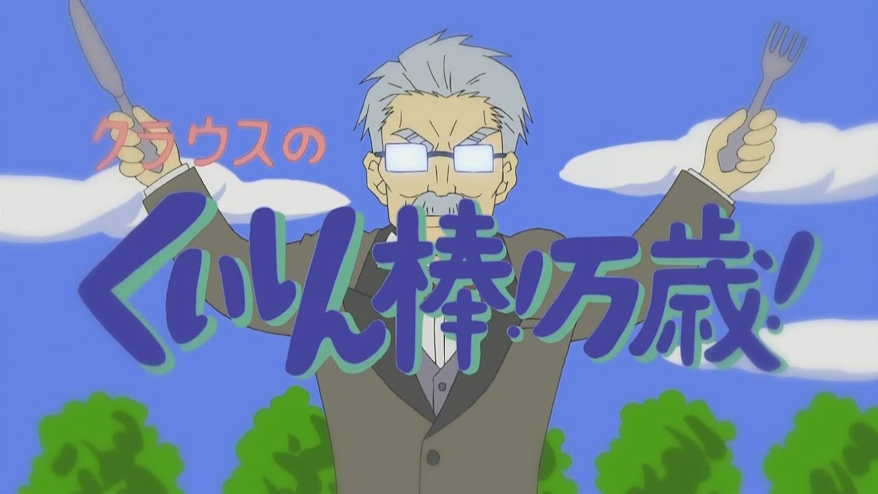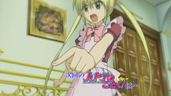 This episode was actually divided into three parts, with the first two being actual plot and the third being comprised of four parody shorts. In order, they were Matsuoka Shuuzou‘s Kuishinbou! Bansai -> Klaus’ Kuishinbou! Mansai!, Sekai no Shasou kara -> Zen Sekai no Shasou kara, Kyou no Wanko -> XX no Wanko (the Xs standing for what’s covered up), and Watanabe Atsushi no Tatemono Tanbou -> Klaus no Otaku Tanbou. Other references I caught included the Tatsumaki Senpuukyaku attack from Street Fighter, Kamen Rider (both weapons that hit Koutarou), Akado Suzunosuke, and the preview for next episode has Hayate uttering a phrase from Pumpkin Scissors.
