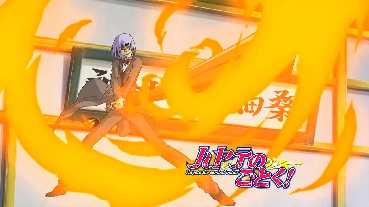 Hinagiku ends up defeating Koutarou fairly easily, but Hayate has quite a hard time against the extremely powerful Nonohara who has his special fire-based attacks. Hinagiku is very surprised when Hayate and flames get blown past her, so Himuro explains that first class butlers have super-deadly techniques at their disposal. Hayate is quite impressed by Nonohara’s ability, but he knows that he can’t learn such techniques in the short time that he has, leaving him at a disadvantage. What does help Hayate is Himuro suddenly mentioning overlooking garbage, which causes Hayate to realize something just in time for him to escape Nonohara’s next flame attack. Koutarou somehow ends up being roasted instead, and Hayate appears behind Nonohara to get the hit that wins the match. Afterwards, Nonohara admits his defeat and is impressed with how Hayate picked Koutarou off the floor and used him to take the attack. Nonohara wants Hayate to learn his own deadly techniques for the next time they meet so that they could fight more seriously. As for Nagi, she thought that Hayate and Hinagiku looked cool, but she doesn’t want to return to the kendo club because the equipment still stinks.