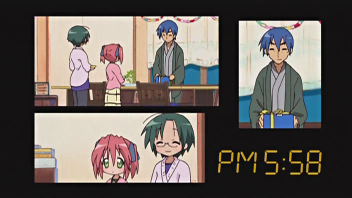 >>> – Discussion of whether it’s better to be an only child or have siblings. Somehow leads to a corny 80s video of the Hiiragi 4 (any idea if this is a reference to something?)