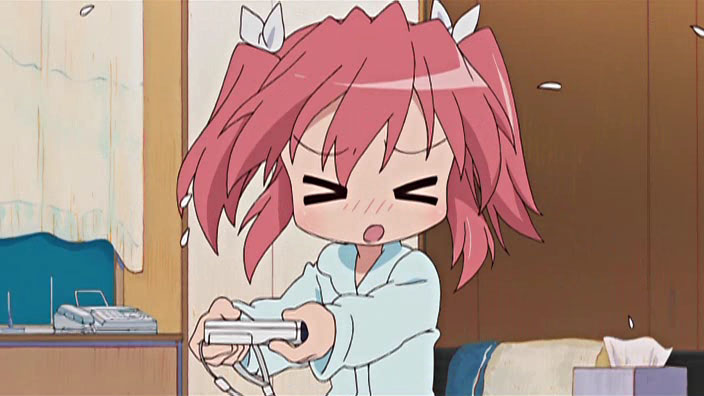 – Yutaka talks quieter on the phone as to not disturb Konata (it’s exams time), only to have Konata walk in and ask her to play video games with her.