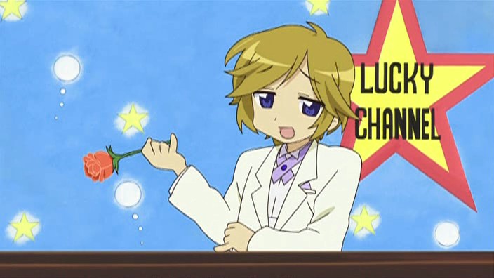 Ono Daisuke’s unexpected appearance had me laughing for reals, which is somewhat of a rarity in Lucky Star. He’s wearing a white suit that looks a lot like the one he wore for Gekisou, and together with the rose in hand, looks every bit as smooth in his Lucky Star form as he ever has.