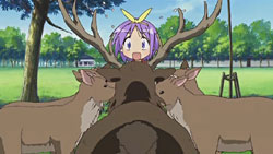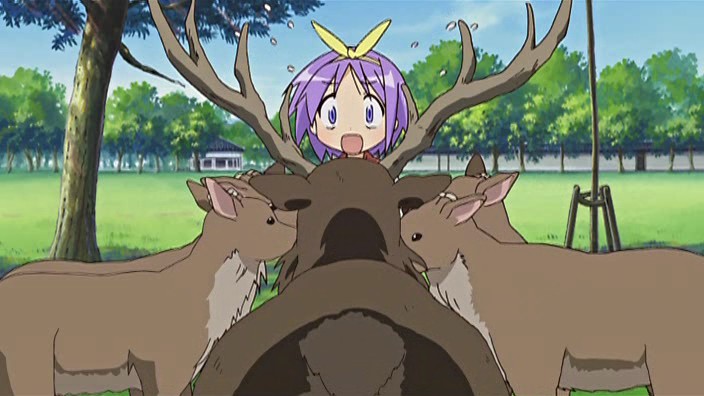 I was in Kyoto and Nara just over a week ago, so watching this episode the other day was a bit surreal… anyway this is now my fav Lucky Star episode by far. And yes DON’T BUY DEER COOKIES YOU WILL END UP LIKE TSUKASA. It’s like buying a “kick my ass” t-shirt written in deer language for 150円. I was walking around covered in deer slobber for the next hour. Luckily it’s freaking hot there right now so it dried up quick O_o And yes they bite in order to get you to give up the cookies.