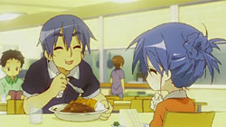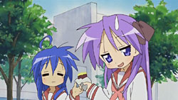 – Kagami munching down on a roasted sweet potato as Konata looks on. Now you know where she gets all those jokes.