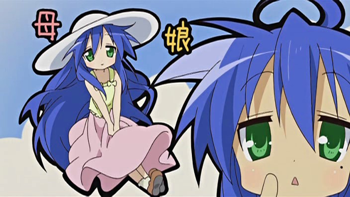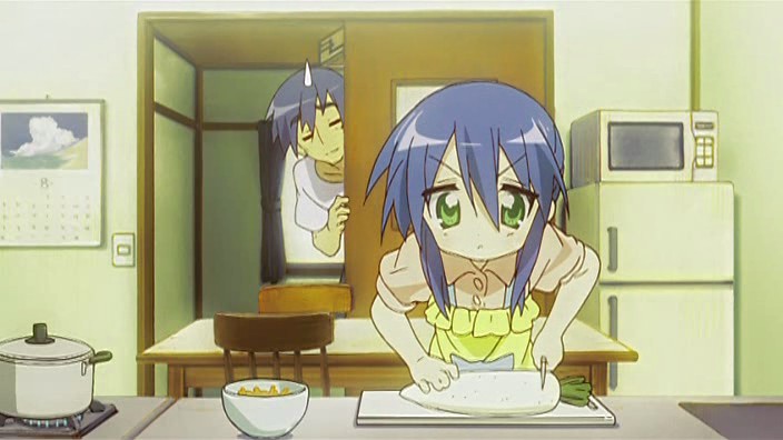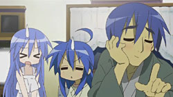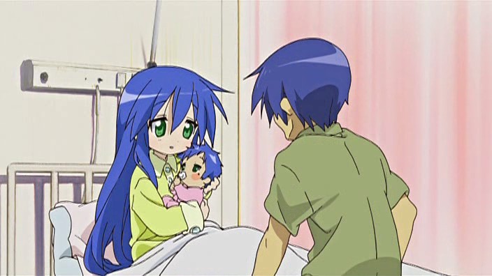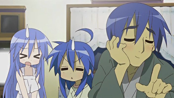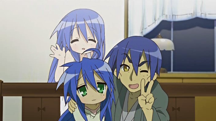 It is a bit odd reading the comments about Kanata. Because Konata told very early (like somewhere in the first three episodes) in the series to Kagami about how young she was when her mother died… and made the obvious joke how much better of a cook Konata is because of that. It was established long before Kona-dad was even mentioned.
