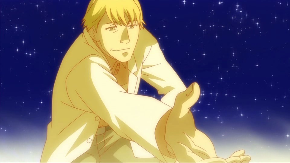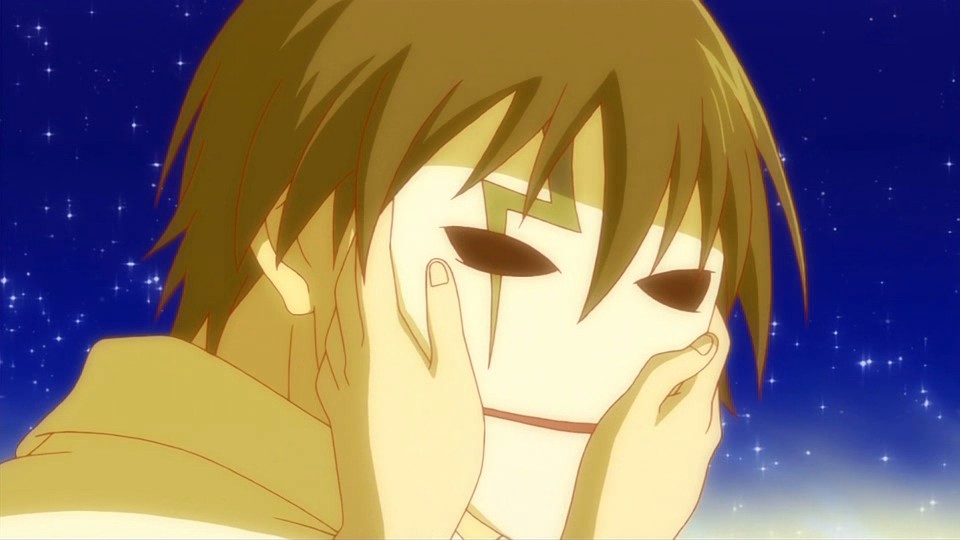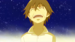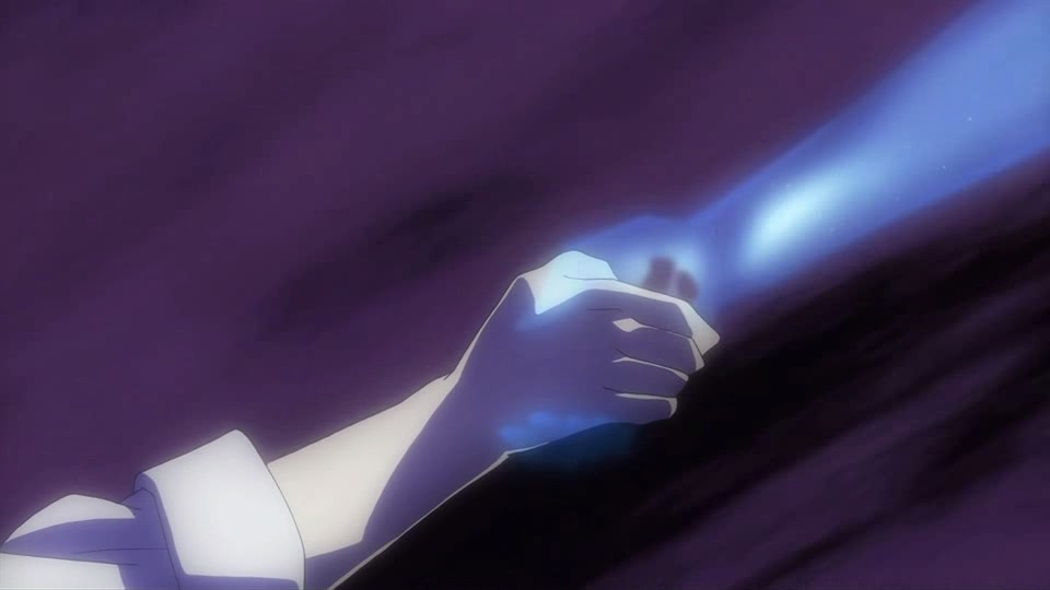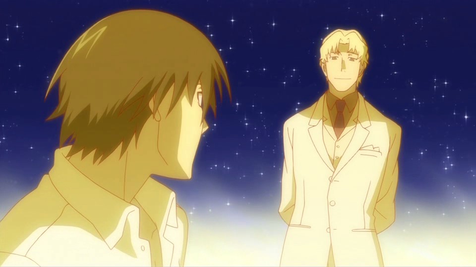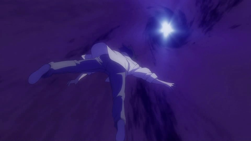 A moment before Nishijima presses the switch that shoots the anti-Gate particle, Amber touches Hei’s chest with the meteor fragment. A bright light rapidly expands to cover the entire city, and Hei suddenly finds himself younger and in a yellow-orange hued world where the sky clears into a field of stars. This causes him to start crying because he didn’t want everyone to disappear, but to his surprise, he hears Bai ask him what’s wrong in a scene from their past. She thinks that he’s lying when he claims that it’s nothing and questions why he’s crying. Bai reveals that she had noticed that he didn’t actually want to kill anyone and had been doing things he didn’t want to do for her sake. Hei tries to deny it and say that it’s because he’s the Black Shinigami, but she disagrees. Taking off his mask, she says that her older brother is her older brother, and that’s why she doesn’t want him to try so hard anymore. Huang then shows up to lecture Hei about the same thing, and he cites how Hei’s indecisive attitude had troubled him. Mao is also here, and he notes that this is Hei’s interesting point.