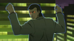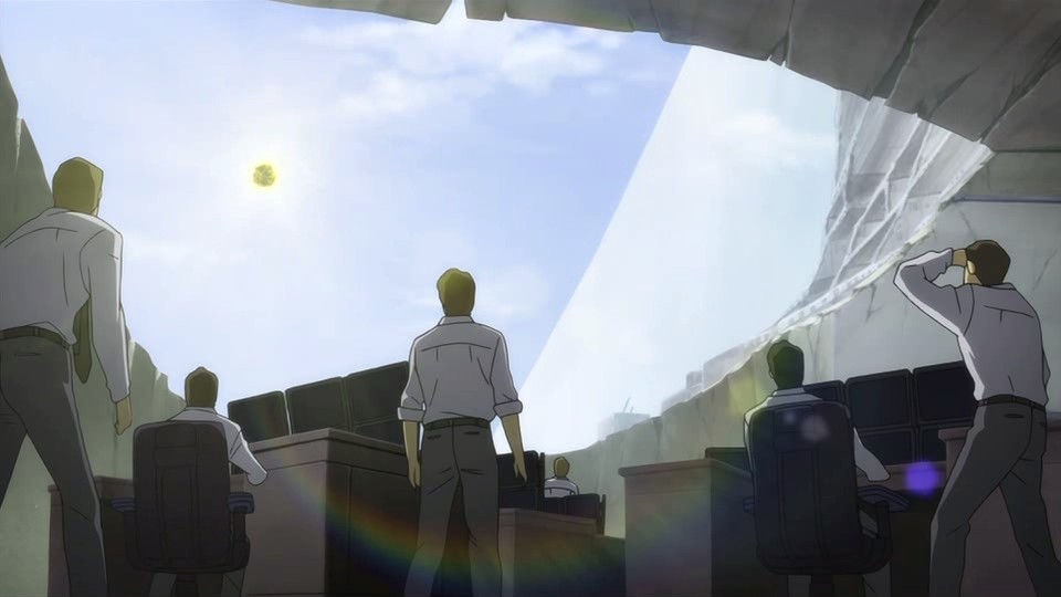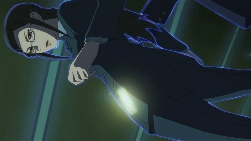 With everyone suddenly glowing blue, they see Hei standing on top of some large machinery on one of the monitors. The shaking and glowing ends as soon as Hei grapples away from camera view, and the roof of the control room then gets blown off. Despite this, Nishijima orders his men to prepare for a second shot, but Schroeder tells him that it’s pointless. Schroeder thinks that Hei’s electric shock and the blue light have caused the anti-Gate particle inside the system to completely mutate. Hei’s electric shock is no ordinary electromagnetic wave because it mutates things at a quantum level. Schroeder compares it to a regular person becoming a Contractor, and he theorizes that the Gate in South America was just like this in how it was filled with mutated substances. Unable to concede the loss, Nishijima punches Schroeder in frustration, but he’s then shot twice in the chest by Hourai. This scares everyone else into running out of the control room, and Hourai calmly places the murder weapon on Nishijima’s chest and puts Nishijima’s hands on it.