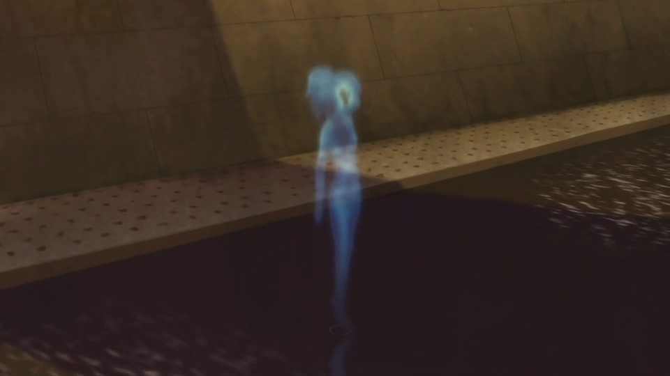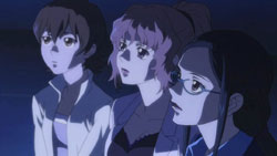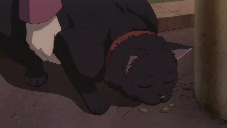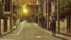 Staring out the window from Hei’s window, Misaki suddenly sees Hei’s figure walking across a nearby bridge, so she dashes out and chases after him, wondering if they chose the same path – the path of living together. She really wants to hear from Hei, but he disappears around a corner, and Misaki can’t find him again. Misaki then gets a call and has to break off her search, so she doesn’t notice the black cat and female shaped surveillance spectre nearby.