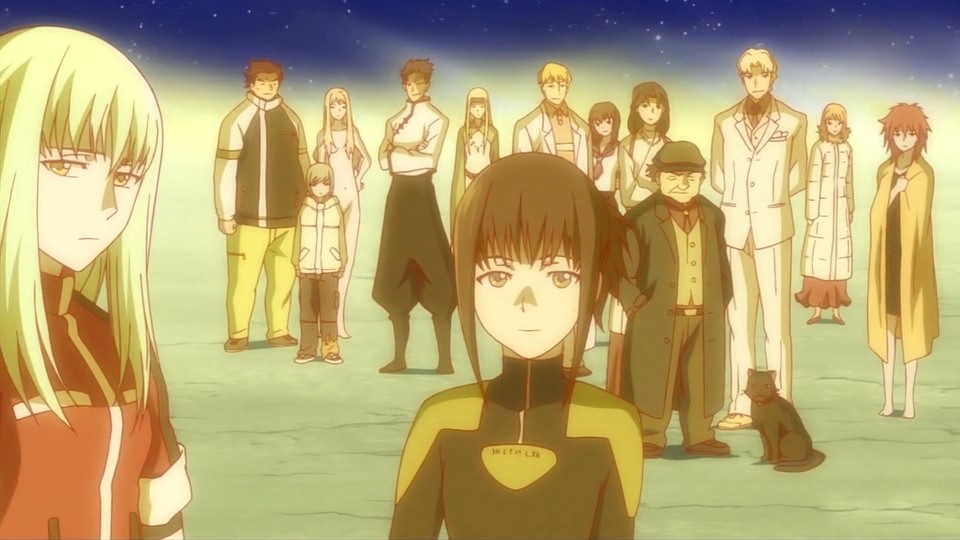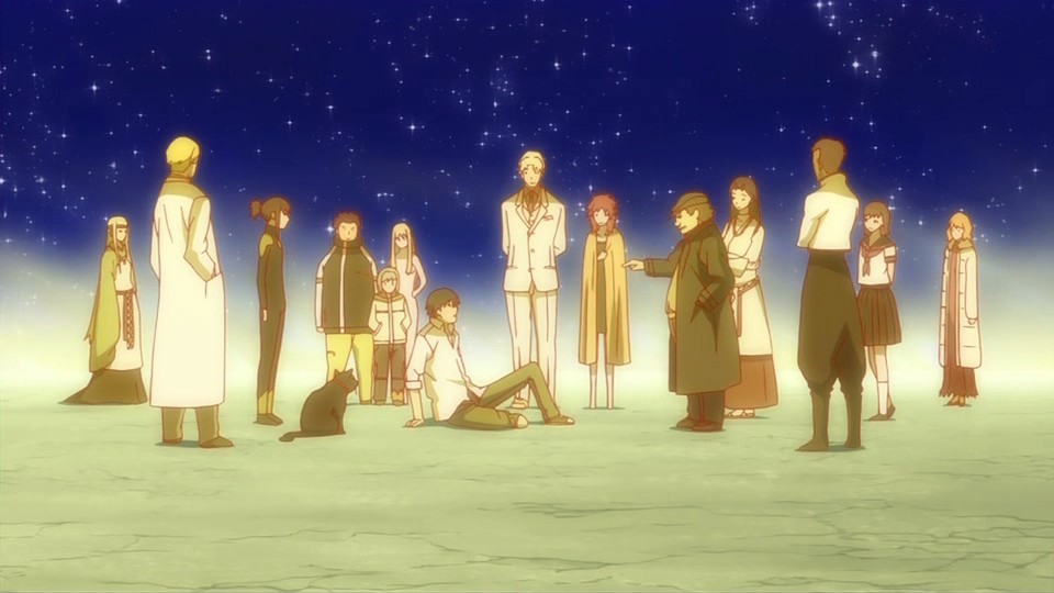 Looks like an awesome ep though. At least the dead contractors and all those whose lives Hei’s touched appear to be in a better place (the fact that Chiaki and Huang are there, a doll and a non-contractor human respectively, seem to indicate that that “after-life” isn’t limited to just contractors). Even Nick makes a reappearance (I was hoping they’d explain why he and Hei seemingly share the exact same powers). I also see Brita (nekkid teleporter chick) there too, implying that she’s dead (guess that explosion that took out all those encapsulated dolls got her and the rest of the EPR members), along with Mao (which is a bummer, I was hoping Mao just soul-shifted to another person or animal). If only they’d explain the significance of the old woman stargazer (whom I still suspect is Amber).