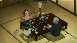 Mizuki escapes a second possible engagement with death, and the two girls spot the ominaeshi they were looking for – later that night, the girls and their grandparents had a memorable nanakusa under the shimmering light of the full moon. 🙂