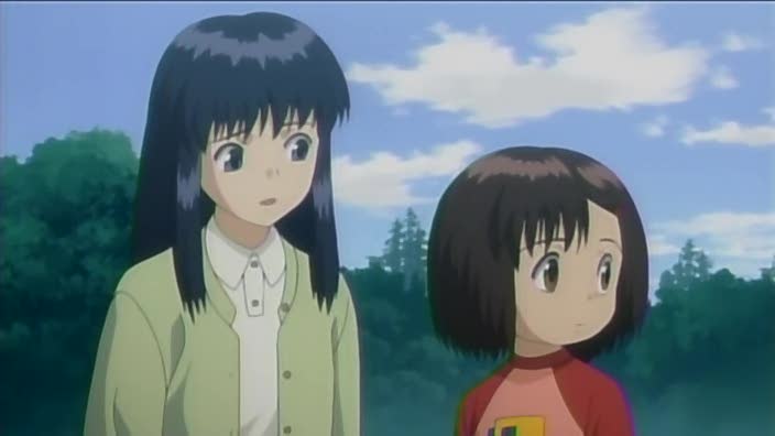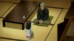 She shrugs of the thought and scurries off deeper into the fields in search of the elusive flower. Away from the wildlife, we are introduced to Mizuki’s onee-san, Shizuru (voiced by Kawasumi Ayako) who is busy doing chores. Shizuru is a girl with the ability to see spirits/youkai (the anime AND the manga names this ability 見鬼/kenki); she also explains that her younger sister is easily haunted by these same youkai as well (referred to as having 憑坐/yorimashi). Shizuru briefly mentions her grandfather as well, a person knowledgeable with folklore who serves as their guardian.