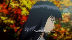 Next Time: A sketch of a cute, furry creature pops up, Mizuki gets trapped in a whirlwind of autumn leaves, and the presence of a *friendly* youkai temporarily brings the show towards the direction of My Neighbor Totoro. Mmm.