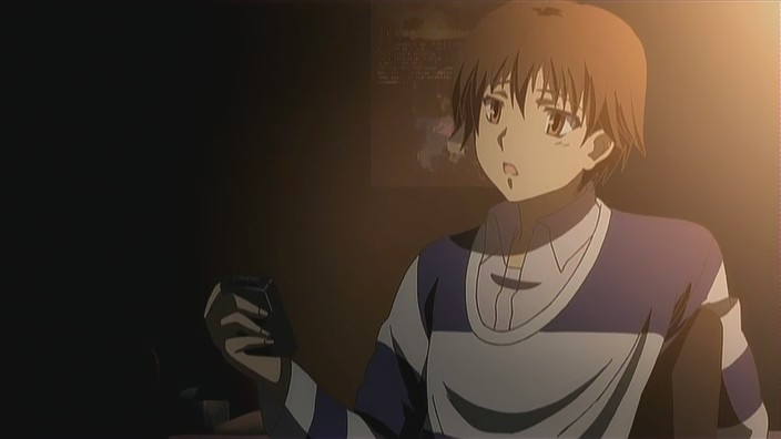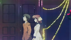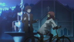 The following day, Renji heads to the station again and sees Chihiro there, but he finds that she seems a bit different from yesterday. It takes Chihiro a moment to realize who Renji is, and she’s so glad that he actually came to see her again that she hugs him. Afterwards, they get to talking about the novel that Renji is carrying with him and the diary that Chihiro has with her that she apparently can’t live without. She eventually asks if they can be friends, and Renji is glad to do so. When it’s time for him to go, Renji again says that he’ll see her later, and this makes Chihiro quite happy because she sees it as a promise to meet again. Once she’s alone, Chihiro tries to write in her diary, but she starts crying instead with her thoughts on her sister. Unaware of this, Kei is playing cards in the White Christmas world while Hiro and Miyako are walking around town together. Their classmate Tsutsumi Kyousuke is also up at this late hour staring at a blurry photo of Kei that he had taken on the street.