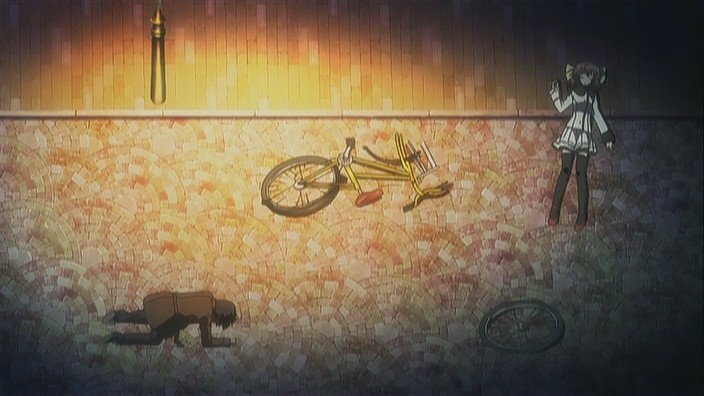Once outside, Hiro receives another message from Kei asking him where he is, and as he is reading it, someone races past on a moped. Chasing after this person is a girl yelling about a thief, and after questioning Hiro which direction the moped went, she takes his bicycle and rides off. This leaves Hiro no choice but to go after her to get back his bike, and to complicate things, Kei calls him as he’s running. Since he’s busy, he tells Kei that he’ll come another time and then hangs up on her. Hiro manages to catch up with the girl who took his bike when she crashes it and gets thrown off. Unsure if she’s still alive, he is surprised when she suddenly opens her eyes and initially doesn’t remember what’s going on. She then recalls that her bag was stolen with all of her important things in it, and she’s determined to get it back. However, after a bit more searching, she easily gives up and downplays the importance of her wallet and cell phone. Hiro is more concerned about if she got hurt earlier, but she claims that she’s fine and thanks him for worrying about her.