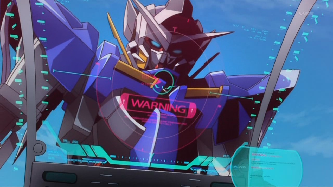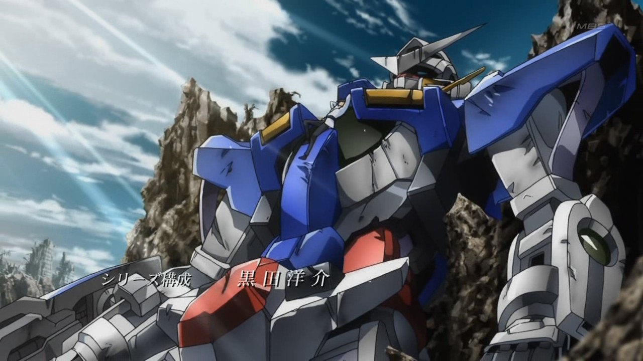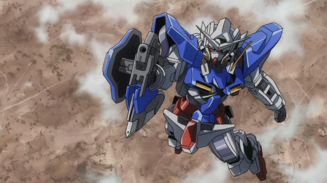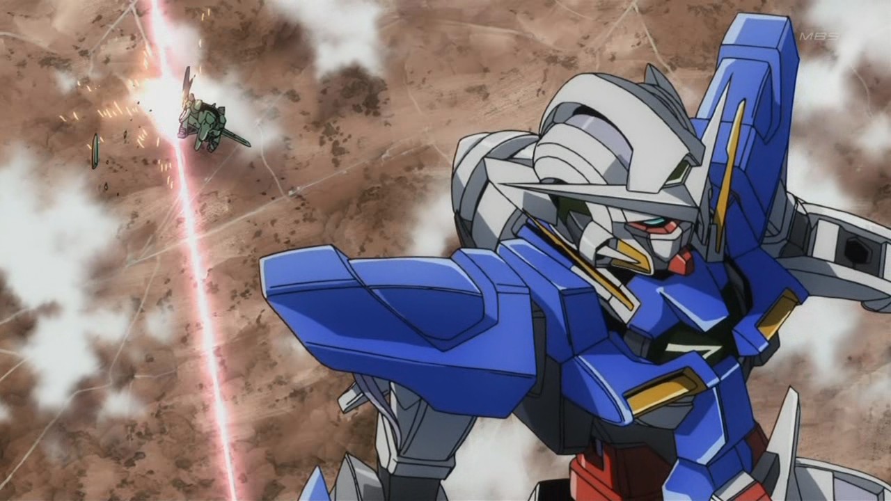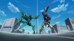 Unbeknownst to them, another mobile suit – the Exia – is falling rapidly through the atmosphere with Setsuna as its pilot. His target is the Enact, and he starts the first phase of his operation. The people on the ground soon detect the Exia’s approach, and Graham realizes that this isn’t another one of the AEU’s new models. Once the Exia lands on the ground, the pilot of the Enact, a man named Patrick Corlasawar, pulls out its sonic blade and charges. Setsuna responds by telling the Exia to destroy their target, and the Exia promptly cuts off the Enact’s hand. An angry Patrick then tries to shoot his opponent at point blank range, but the Exia is able to dodge it and proceeds to slice off both of the Enact’s arms as well as its head. Grabbing a pair of binoculars from the guy in front of him, Graham sees that the word GUNDAM is written on the Exia’s head, but he’s never heard the term before and thinks that it’s the name of this mobile suit. Inside the cockpit, Setsuna tells the Exia that the first phase is complete, and he starts the second phase. Watching the Exia fly away, Graham wonders if this was a warning and thinks that the AEU won’t stay silent about it.
