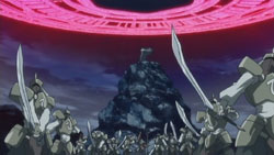 Back in the present, Priecia and Hyaweh take care of Sister Hell’s soldiers, but when the going gets tough, the rest of their allies – Kagura, Fel, and Karin – come to help. In response, Sister Hell called forth a large metallic warrior called an Angel, and it proceeded to try to smash Hyaweh’s group. Fortunately, Kagura saves them with a magic barrier, though her power quickly starts giving out under the pressure. Taking charge, Hyaweh decides that when the barrier breaks, Fel and Karin will attack the Angel with their respective magic and swords to keep it from moving while he and Priecia destroy its Prism. Priecia doesn’t think it’ll work, so Hyaweh points out the importance of believing in their own power and that of their friends. When the barrier does break, Fel and Karin do their part, and Hyaweh and Priecia start to charge up the side of the Angel. However, Priecia gets shot off the side and starts falling, so Hyaweh jumps after her and grabs her in mid-air, reminding her that he promised not to let her go no matter what happens.