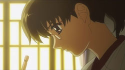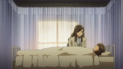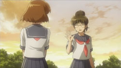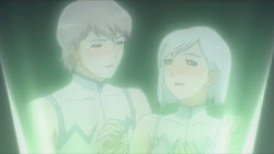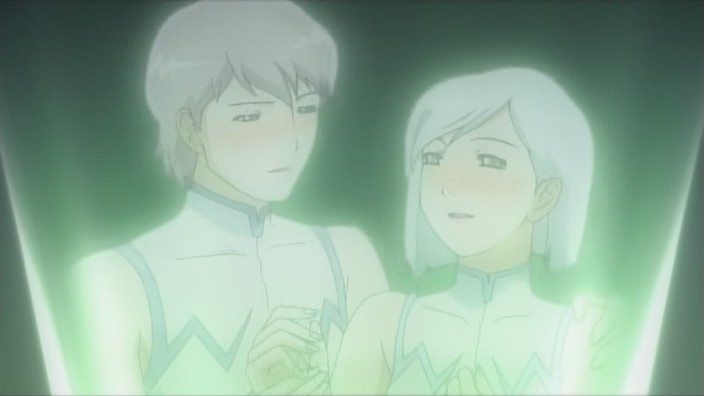 At the school, Michiko shows up to apologize to Yuuko and to say that she can’t write the script even though she really wants to. She faints in the middle of this and wakes back up a little later in the infirmary. Staring out the window, she sees Hagino, Tsubael, and Mari walking along the road talking and laughing, and this inspires a story to develop inside of her. By the time Yuuko returns from making a phone call, Michiko is long gone. She rushes straight back to the dorm and starts writing. Back on the Blue, Azanael continues watching the hologram of herself and Onomil, and she also stares at the pendant that Onomil left behind.