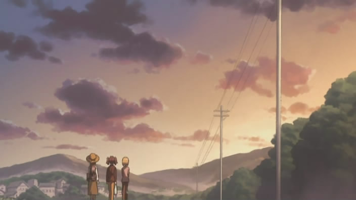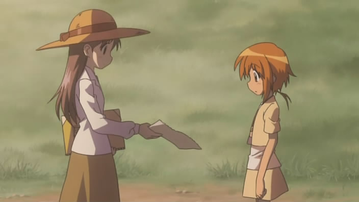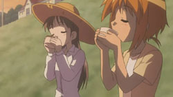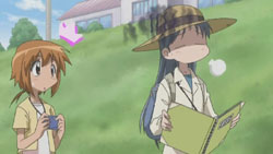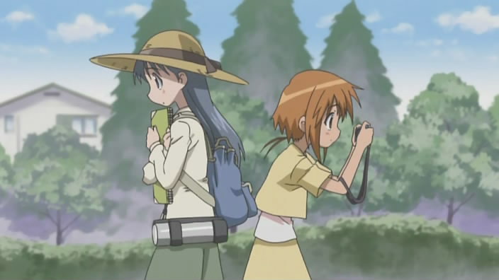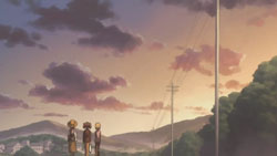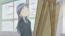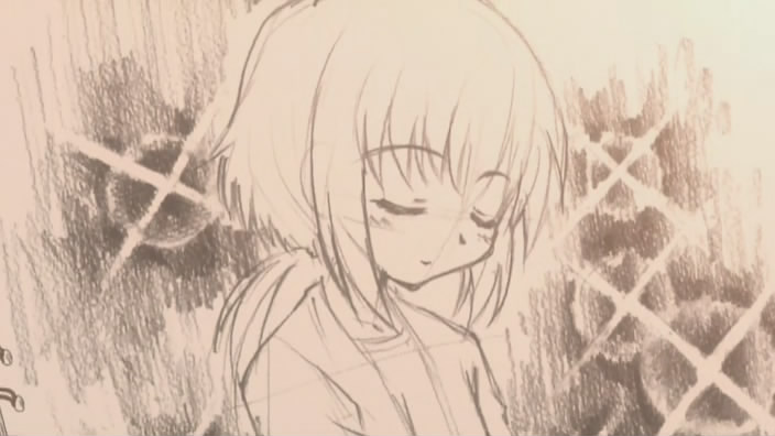 The second half of the episode brings us back down to Sora level as she heads out on a sunny day to do some sketching. She bumps into the camera girl once again, but this time the conversation is able to last for longer than thirty agonizing seconds. To make a short story shorter, Sora tries to sketch some things that are just too fast for her, while camera girl easily snaps up several pictures. Well, why not just draw from the pictures? Ah, clever girl.