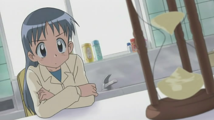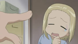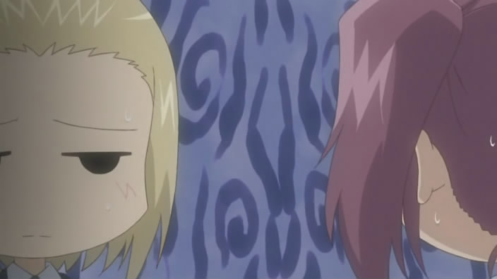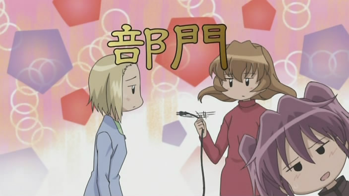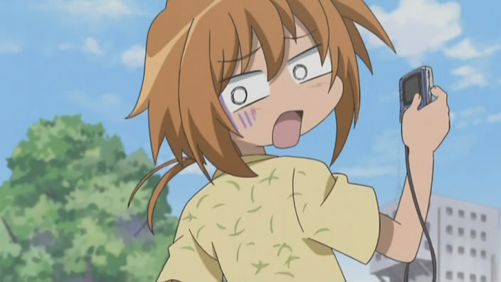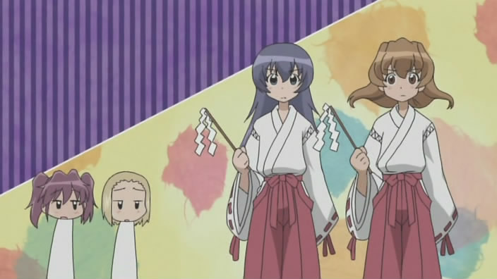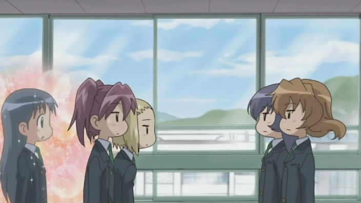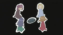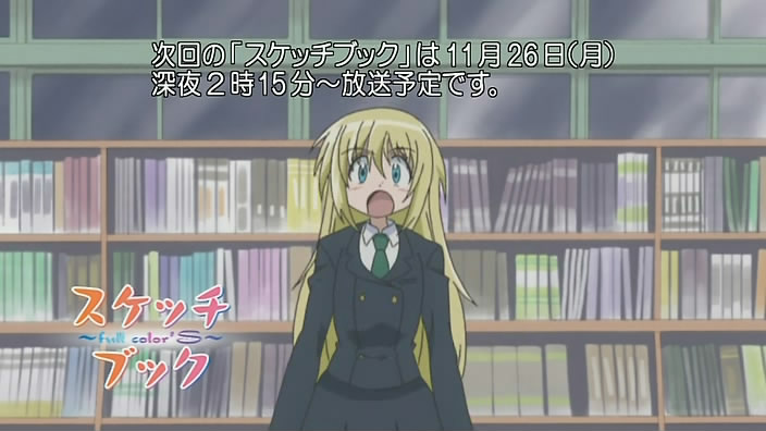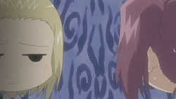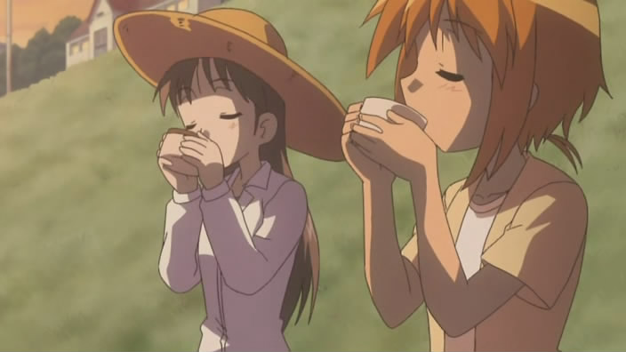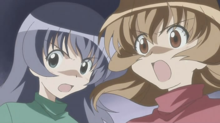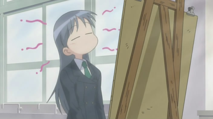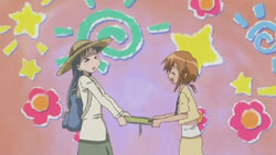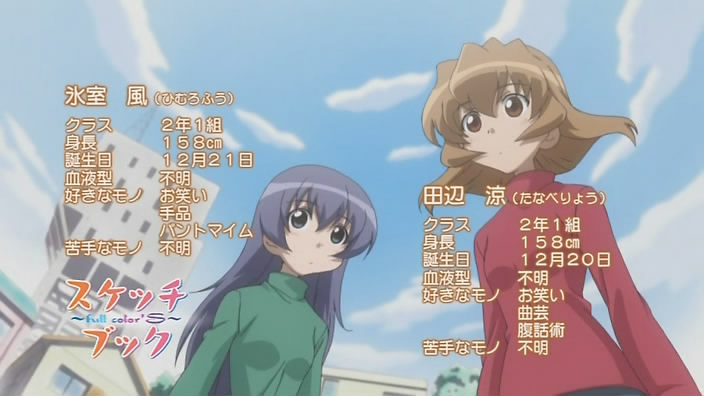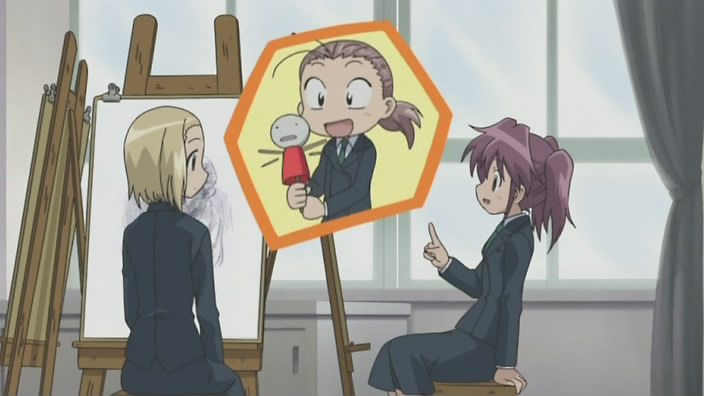 In regards to the second part, it continued to address Sketchbook’s main theme of seeing the world through different eyes. In this ep, Nikon (I can’t remember her name) gets to see herself through the eyes of someone else, and she was rather surprised at the result. While her reaction was borderline… I dunno… braggish (“I’m that cute?”), the point was clear. After all, everyone in this show seems to see things in a different light. Sora makes everything pretty and cute. Hazuki turns it all into a dollar amount. Natsumi plays it out through puppets. Kate seems them as random kanji put together to make the same sound. And camera chick? Well, she has a ultracompact digicam, which, in addition to some nasty redeye, leaves nothing up to interpretation, which showed why it was important for her to see how an artist viewed the world. Sweet.