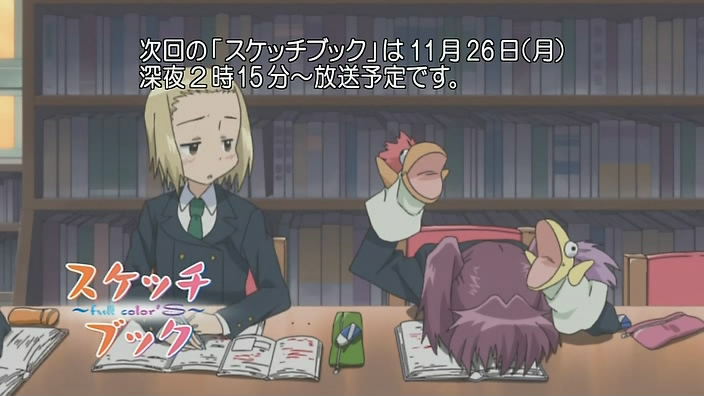 The two psychotwins are probably as close to “fast paced” as this show is getting, but they fit right in perfectly with the rest of the eccentric cast. I’m not sure if their little radio repair stunt was their sense of humor, but man they are weird. And hilarious at the same time. Heck, I can’t describe it – they’re not the kind of weird that gets on your nerves, you know? Mihashi from Furikabutte is weird, but that guy pissed me off. The girls in Zetsubou Sensei are crazy weird, but they’re too one-dimensional, too predictable, even if it is intentional. The psychotwins of Sketchbook? They’re… synchronized. And insane. But lovable at the same time.