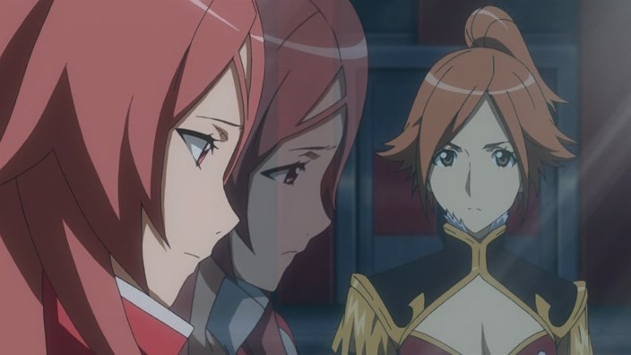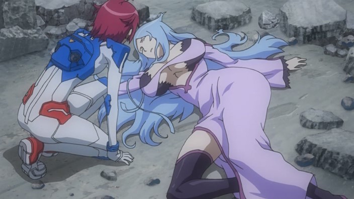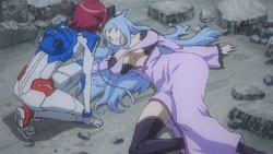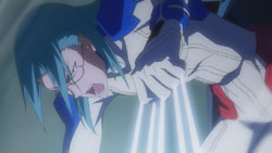 Meanwhile, on Mars, Toa thinks about how it’s because of Jin that she remains as a Communicator and doesn’t want to return to her original form. She then gets brought up in front to Asim again, right as he’s getting another report about what’s going on from Earth. Feeling that she has to do something, Toa offers to show Asim her true form, but Asim knows that she can run away if he lets her out. Asim wants her to beg for it, but even after she does, he still refuses her because he sees her defiant eyes and knows that she’s not under his control yet. Back on Earth, Ostolm fights a heated battle with Nozaki, and Nozaki ultimately gets knocked out when he lowers his guard because Yuuri was in danger. Ostolm then senses that there’s another dragon left – Gio – so he changes back into his dragon form and attacks. Seeing the subsequent destruction as Ostolm chases Gio, Howlingstar and the other members of the Lindworm Unit decide to return to the fight, and they help get Ostolm off Gio. During all this, Kiril is demanding assistance from the Girouard military, but Asim decides to wait until the ISDA is destroyed first. Hearing this causes Nanami to think about Yuuri, and she ends up excusing herself from the throne room.