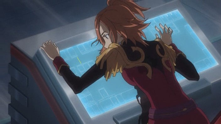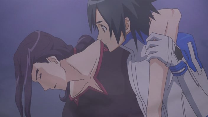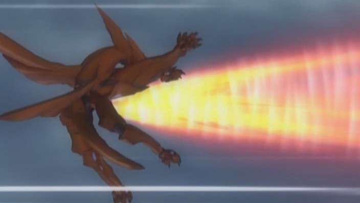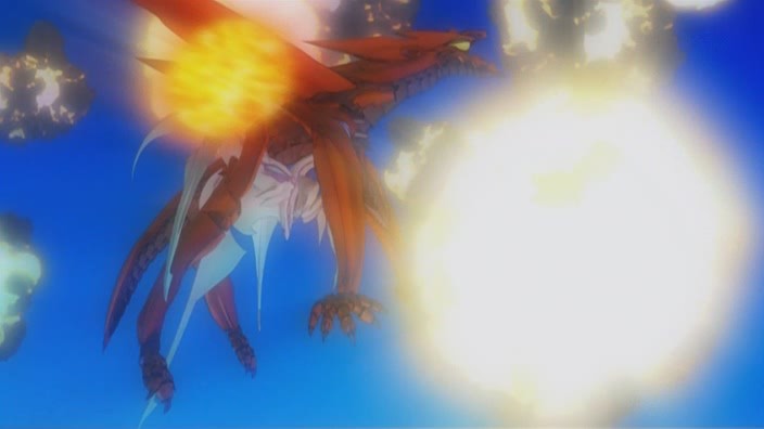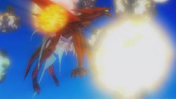 Fortunately, Itsuki and Otohime then join in the battle, and Otohime is armed with a Type-X warhead. To avenge Yuuya, Itsuki intends to force Ostolm to space before using the warhead on him. This plan almost succeeds except that Ostolm fires several fireballs in the air above them, and the explosions causes the warhead to fall out of Otohime’s reach. To Itsuki’s surprise though, Jin and Gio suddenly swoop in to grab the warhead, and they force Ostolm upwards into space right as the warhead goes off. This appears to take out Ostolm, and though Gio is injured, both he and Jin manage to survive the explosion and return back to Earth. With Ostolm now taken care of, Sakaki immediately orders the D-Project to go into its next phase.