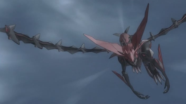 Ten years ago, representatives met with Sakaki and Kiril about the Girouard Military’s new, Type-X warhead. All they needed was a new type of shuttle to use this weapon against Thanatos, and it was the ISDA’s responsibility to develop the shuttle. Kiril, however, had reported that the development of the new shuttle had been a failure. To everyone’s surprise, Sakaki had suggested dragons instead and had revealed that the D-Project was to use dragons to directly attack Thanatos. Back in the present, the members of the Lindworm Unit are picking themselves up after getting defeated, and they see another dragon battling Ostolm in the sky. Yuuri arrives on the scene to explain that it’s Atolm, the third original dragon, and that Atolm is actually Nozaki. After crashing into the ground together, both dragons return to their Communicator forms, and Nozaki has figured out by now that Ostolm is here to eliminate the dragons born on this planet. Ostolm responds by saying that Nozaki has gotten too involved with the living beings of this planet and that “Mother” doesn’t want humans raising dragons. Nozaki, however, refuses to let Ostolm lay a finger on what he refers to as his children, and he believes that if Ostolm went through a Resonance, then Ostolm would understand why he changed.
