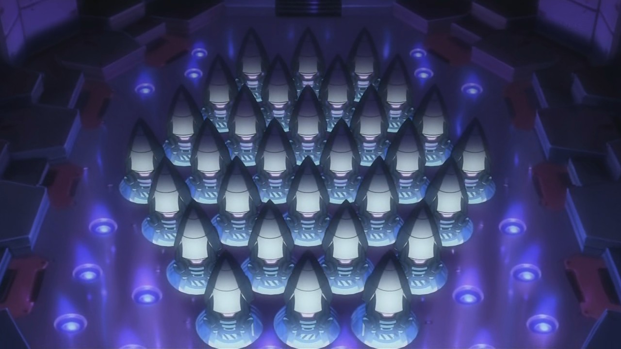 Meanwhile, unbeknownst to the Celestial Being pilots, representatives of the three major superpowers are currently being shown a room in a secret Antarctica facility that houses 30 large pod-like objects.