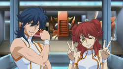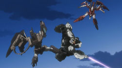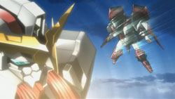 In the surprise attack against the Trinity siblings, Setsuna directs the Exia to strike at Nena’s Throne Drei first, but Michael steps in to protect her with his Throne Zwei. Johann meanwhile tries to reason with Setsuna, saying that they’ve been acting to eradicate war, however Setsuna feels that they aren’t representative of Gundams. This leads to Johann giving his brother permission to fight back, so Michael sends out his GN Fangs. Setsuna is able to destroy most of them, but when Michael releases the last two Fangs, it’s a particle beam blast from the Gundam Virtue that blows them up. Up in space, word reaches the Ptolemaios of the battle, and Allelujah notes the possibility that the Trinity siblings’ behavior is part of the master plan. Sumeragi responds by pointing out that their own actions might also be part of the plan, and though she decides to have Lockon try to stop the fight, she’s willing to respect his judgment based on the situation down there. Wang Liu Mei also learns of what’s going on, but she’s less concerned about what to do about it and instead cares about changing to world, no matter what it takes. As for Alejandro, he tells Libbons that this happened faster than he thought it would. He thinks about how this transitions them to the third stage, and that means that there’s no turning back.