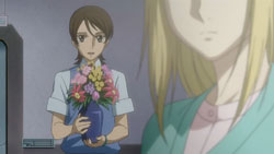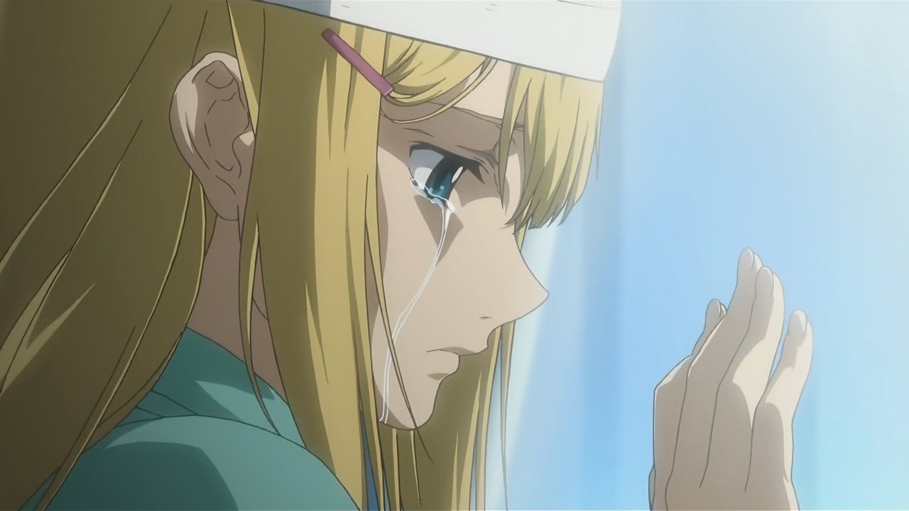 To his surprise, Louise tells Saji to go back to Japan because he’s missing too much school. She’s happy that she was able to be with him, but she doesn’t think that he should be stay here indefinitely and cites how his dream is to work in space. She doesn’t want to be the reason he doesn’t realize that dream. Louise then reveals that her own dream is for Saji to realize his dream, and she proceeds to entrust her dream to him. Saji eventually agrees to go, and as he’s walking out of the hospital, he remembers all the time he’s spent with Louise, including how they first met when Louise approached him out of the blue one day to lecture him about falling asleep at a table. Watching Saji leave the hospital now, Louise can’t hold back the tears any longer. Back in Japan, Kinue’s partner brings her a report on a person named Laguna Harvey who is the president of a linear train business, meaning that he both has the money to build mobile suits and the ability to use the orbital elevator whenever he wants. Her partner thinks that they should stop looking into this because this man is a major shareholder of JNN stock, but Kinue refuses to give up now that she’s finally gotten a clue.